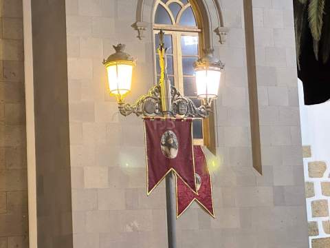 Desde este domingo la plaza de San Juan Bautista y el interior de la basílica lucen más de una decena de faldones y estandartes que anuncian las fiestas del Santo Cristo de la ciudad. El color bermejo impregna las farolas y los pilares del lugar.
