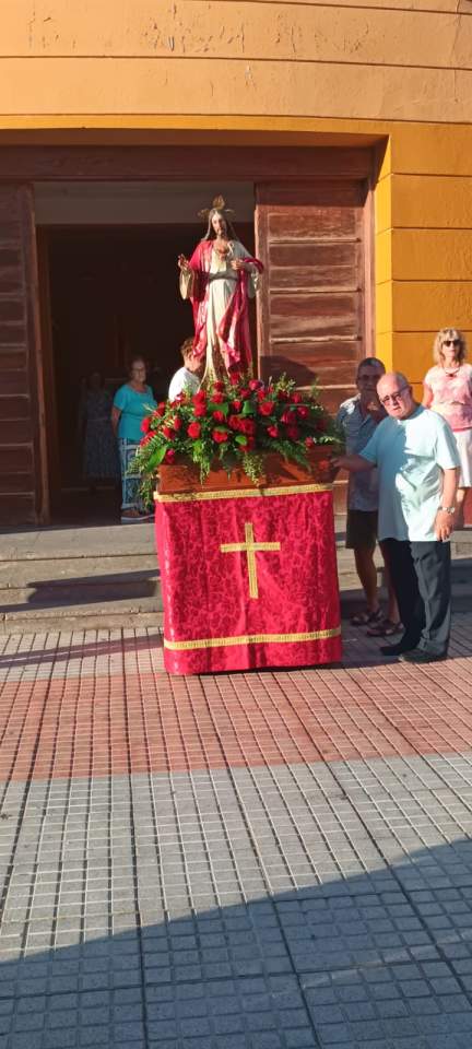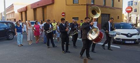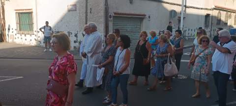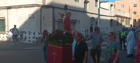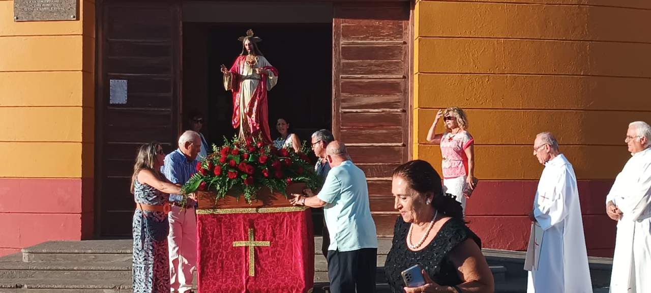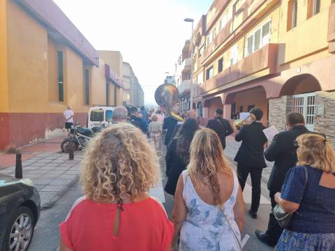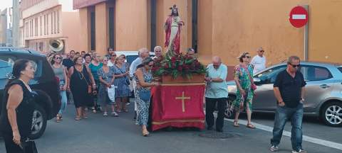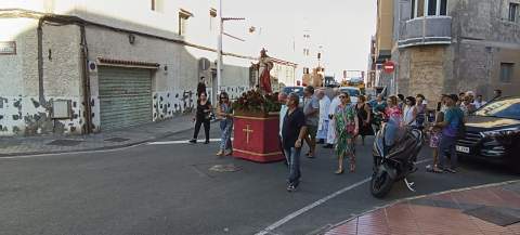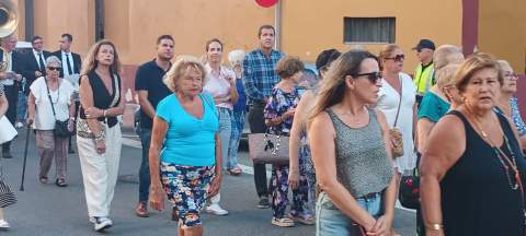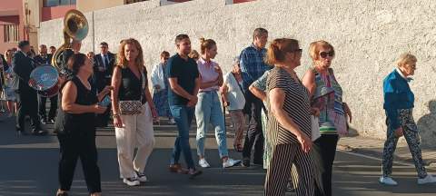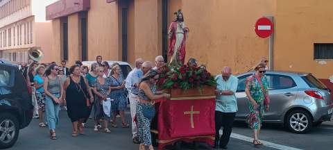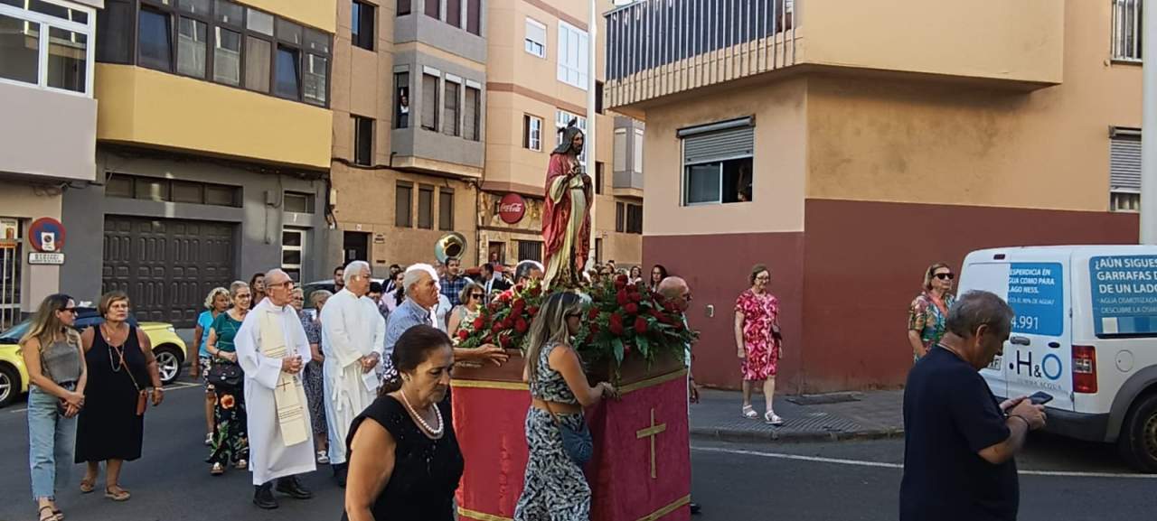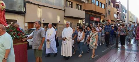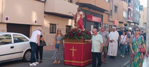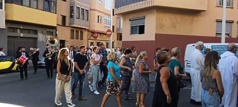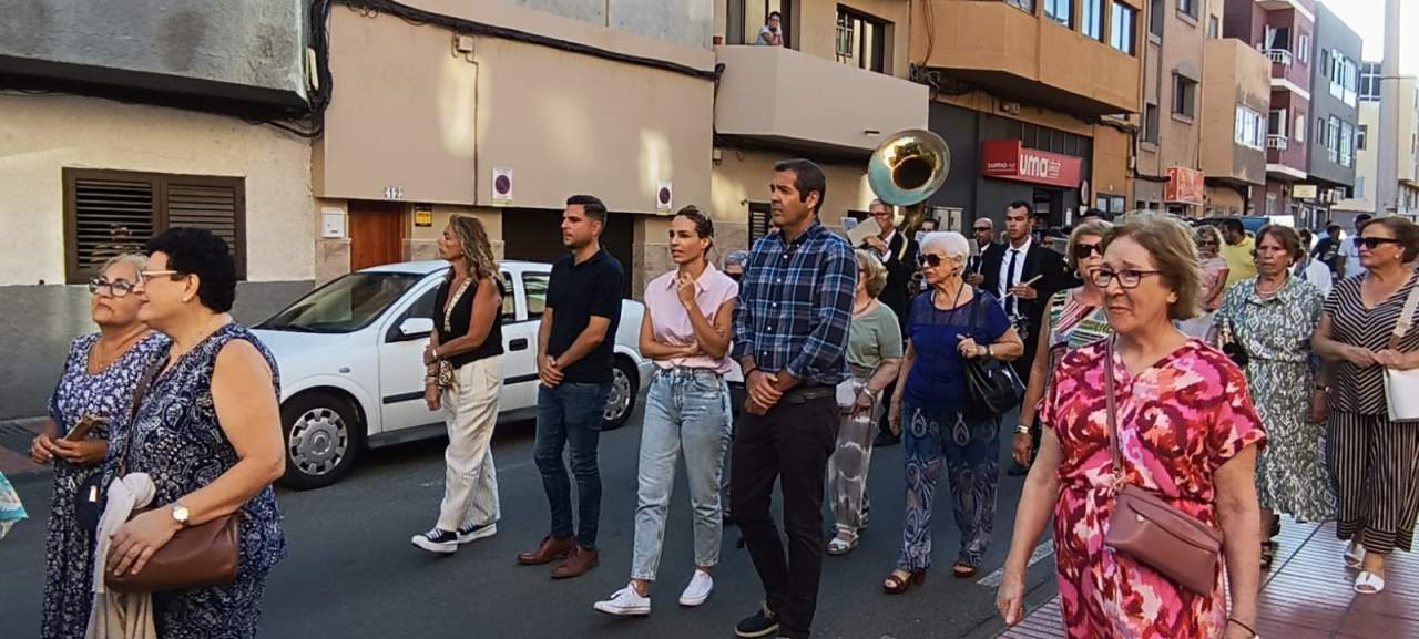 El desfile religioso, acompañado por fieles, autoridades municipales y la Banda de Música de Telde, circuló por las calles de Crisantemo, Azahar, Orquídea y de nuevo Crisantemo hasta su entrada en la iglesia.