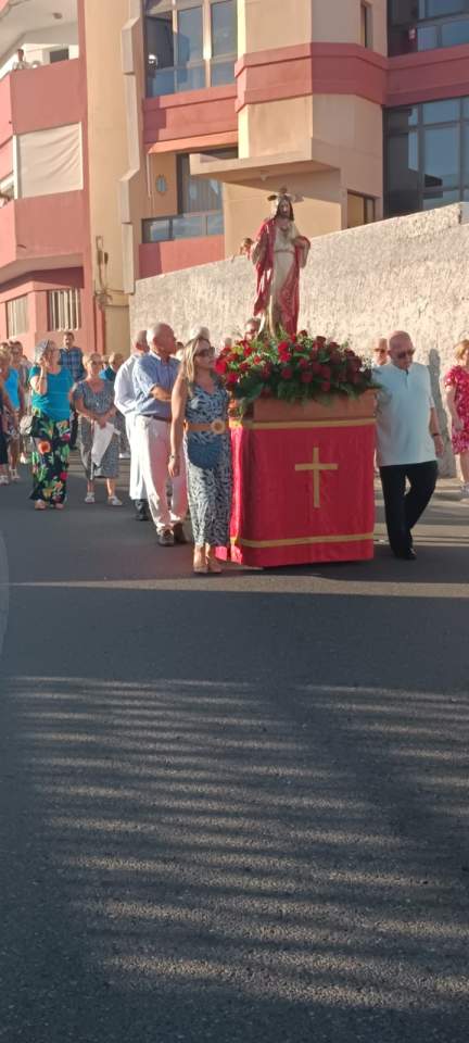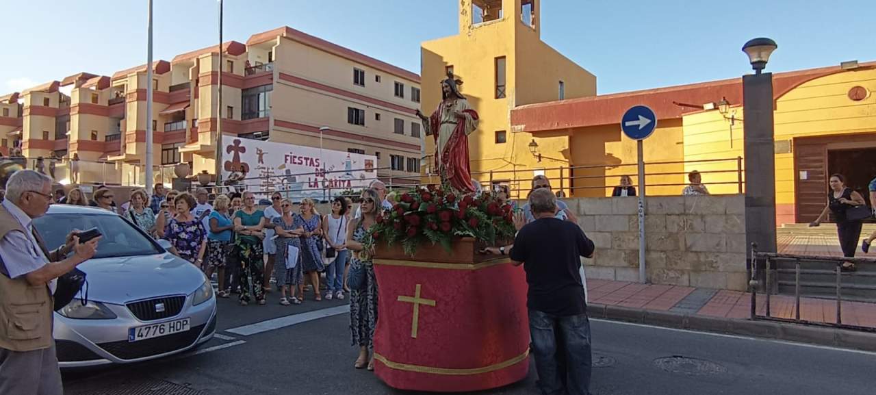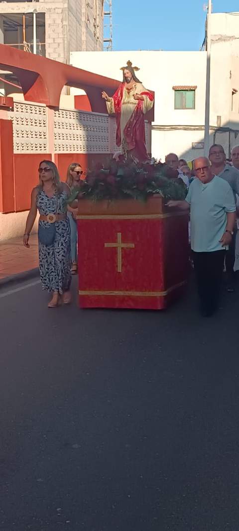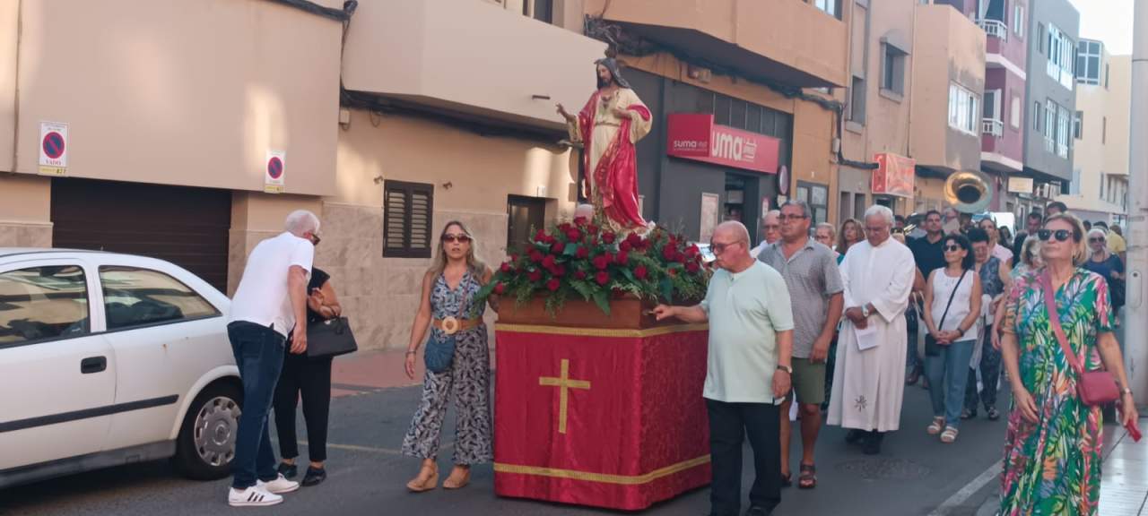 Las calles de La Garita asistieron esta tarde al paso de la procesión del trono del patrono del barrio, el Sagrado Corazón de Jesús, tras la misa de acción de gracias oficiada en el templo parroquial por el sacerdote José María Cabrera.