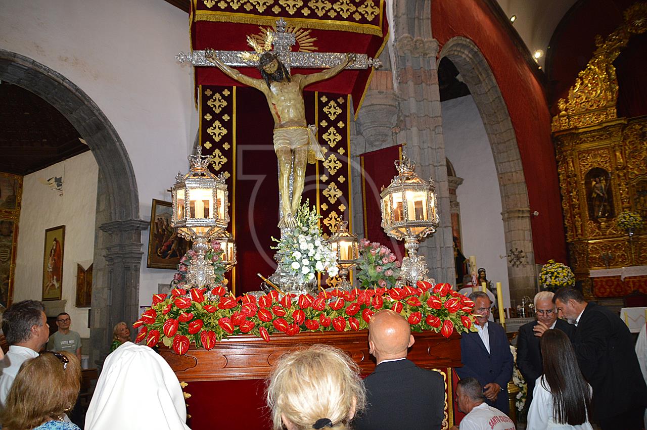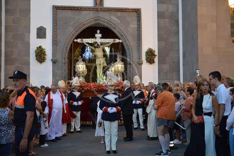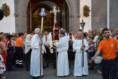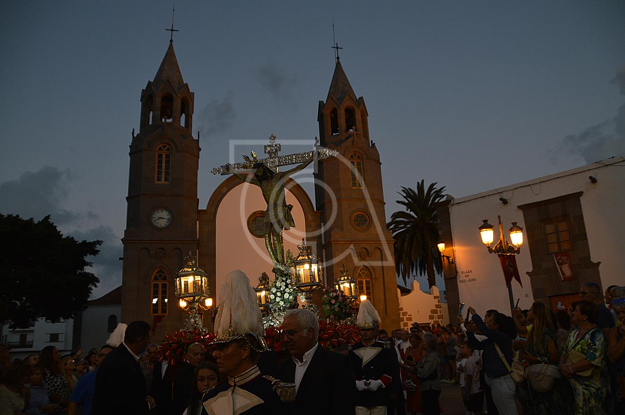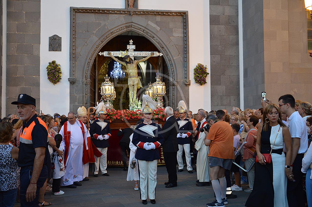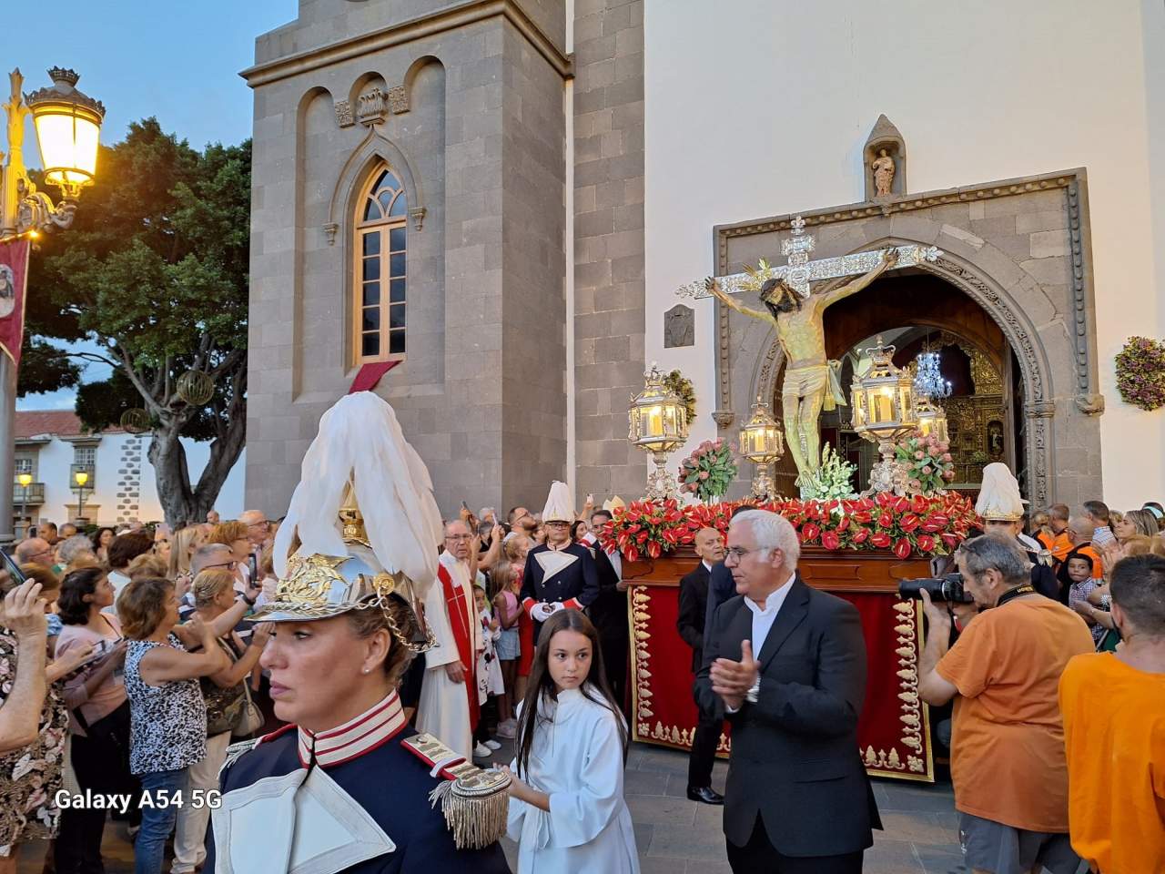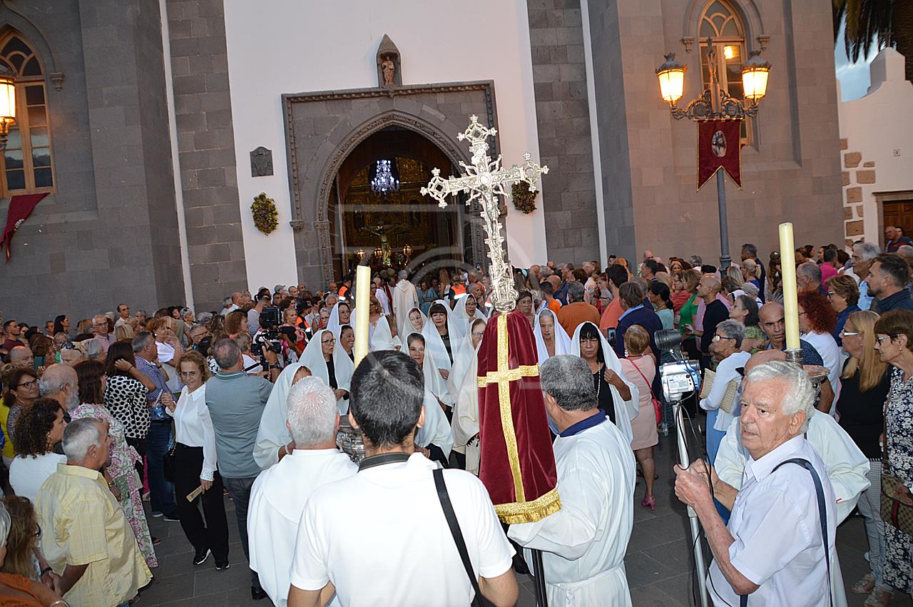 Tras la eucaristía, que estuvo presidida por el obispo de la Diócesis Canariensis, José Mazuelos Pérez, y que comenzó a las 19.00 horas en una abarrotada Basílica de San Juan, la imagen inició el recorrido en su trono, entre vivas y aplausos, sobre las 20.15 horas, con el bastón de mando de la ciudad a los pies de la cruz forrada de plata repujada.
