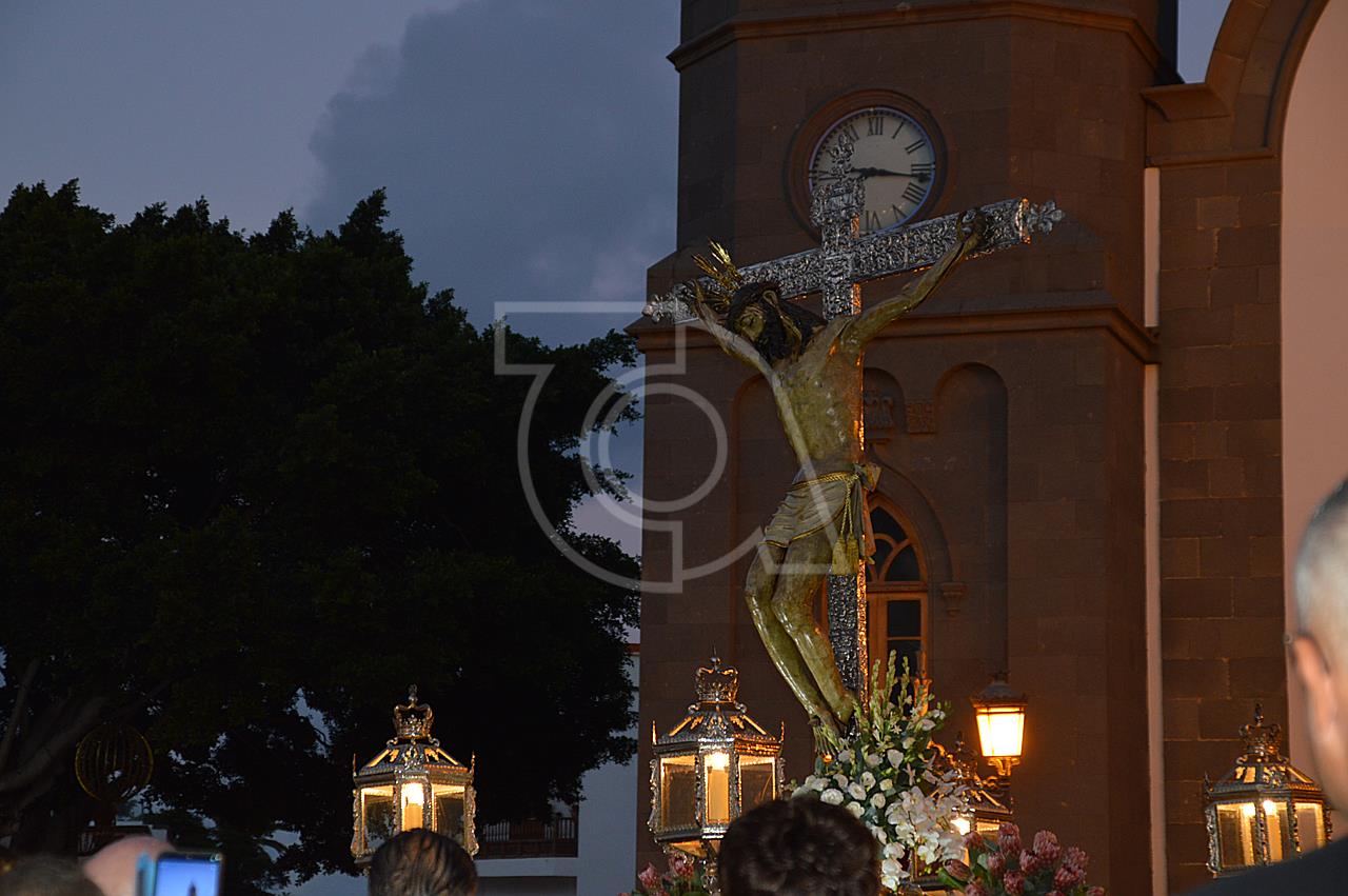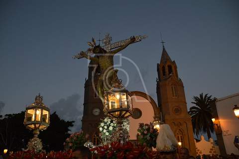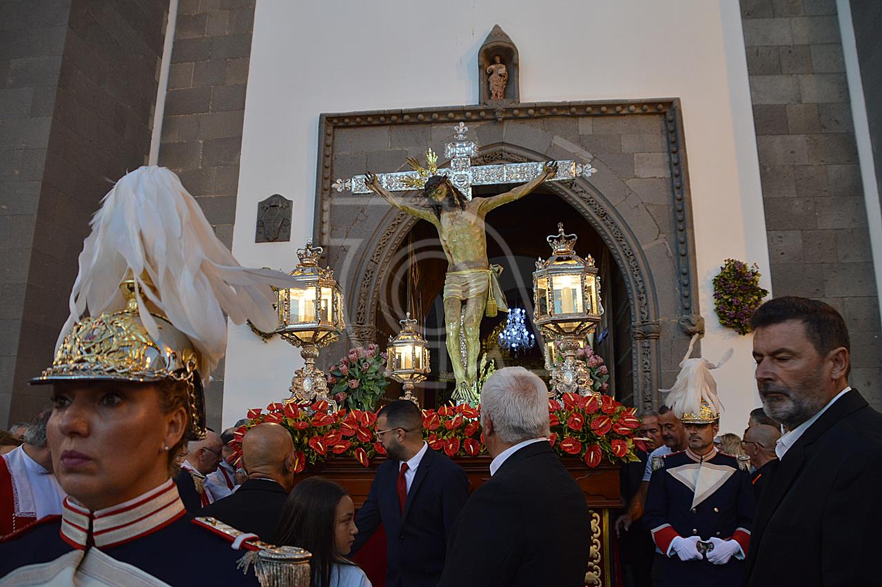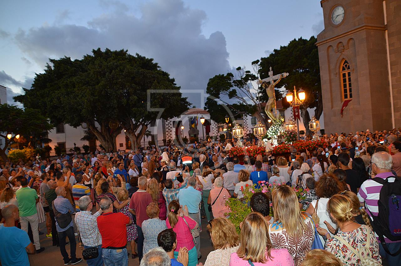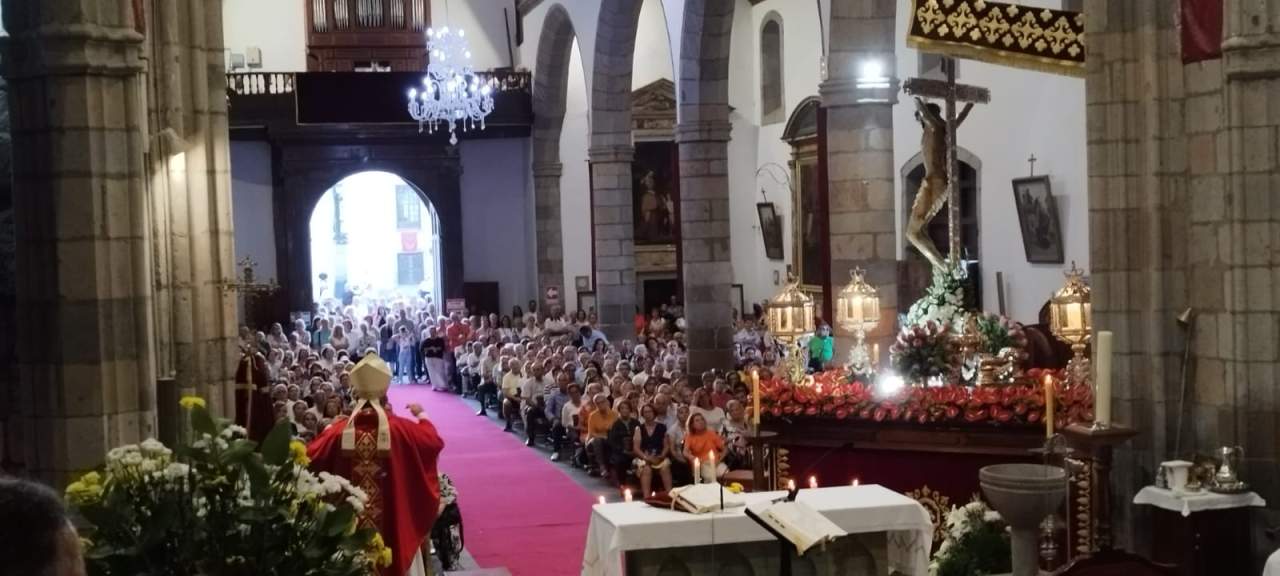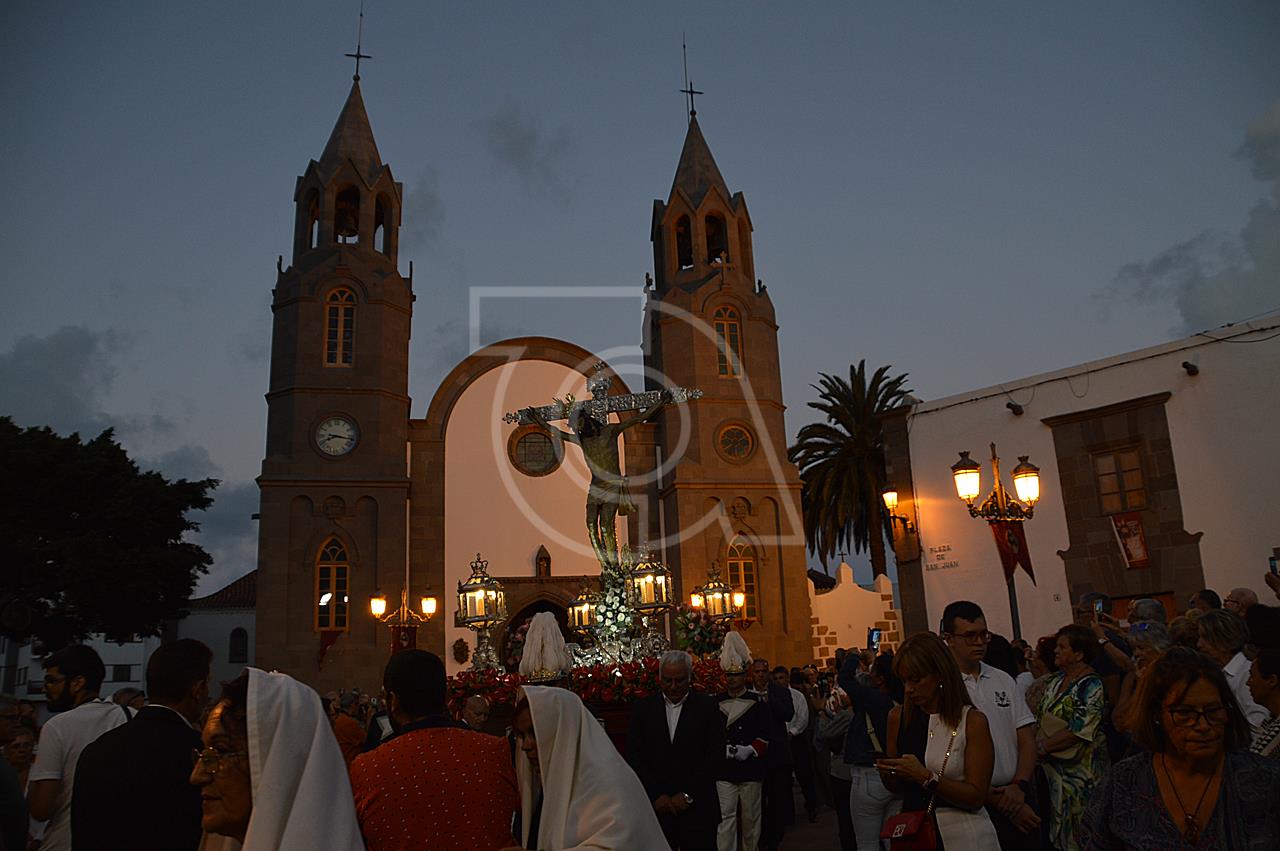 Tras la eucaristía, que estuvo presidida por el obispo de la Diócesis Canariensis, José Mazuelos Pérez, y que comenzó a las 19.00 horas en una abarrotada Basílica de San Juan, la imagen inició el recorrido en su trono, entre vivas y aplausos, sobre las 20.15 horas, con el bastón de mando de la ciudad a los pies de la cruz forrada de plata repujada.