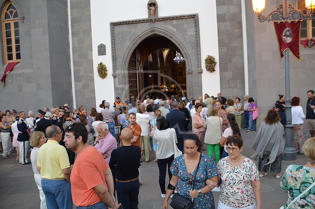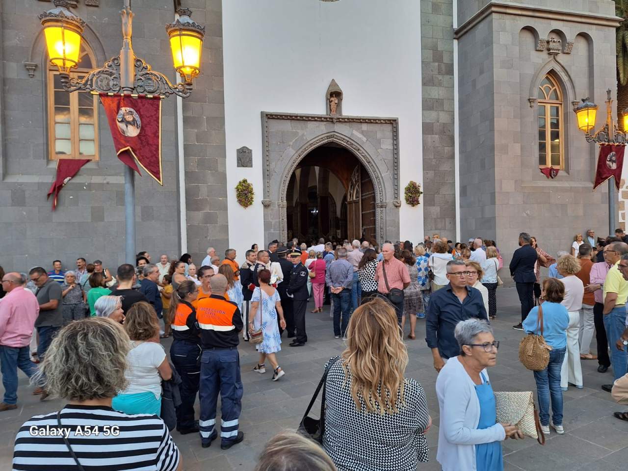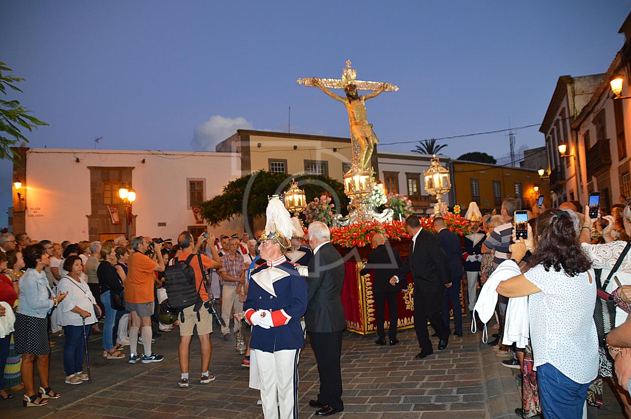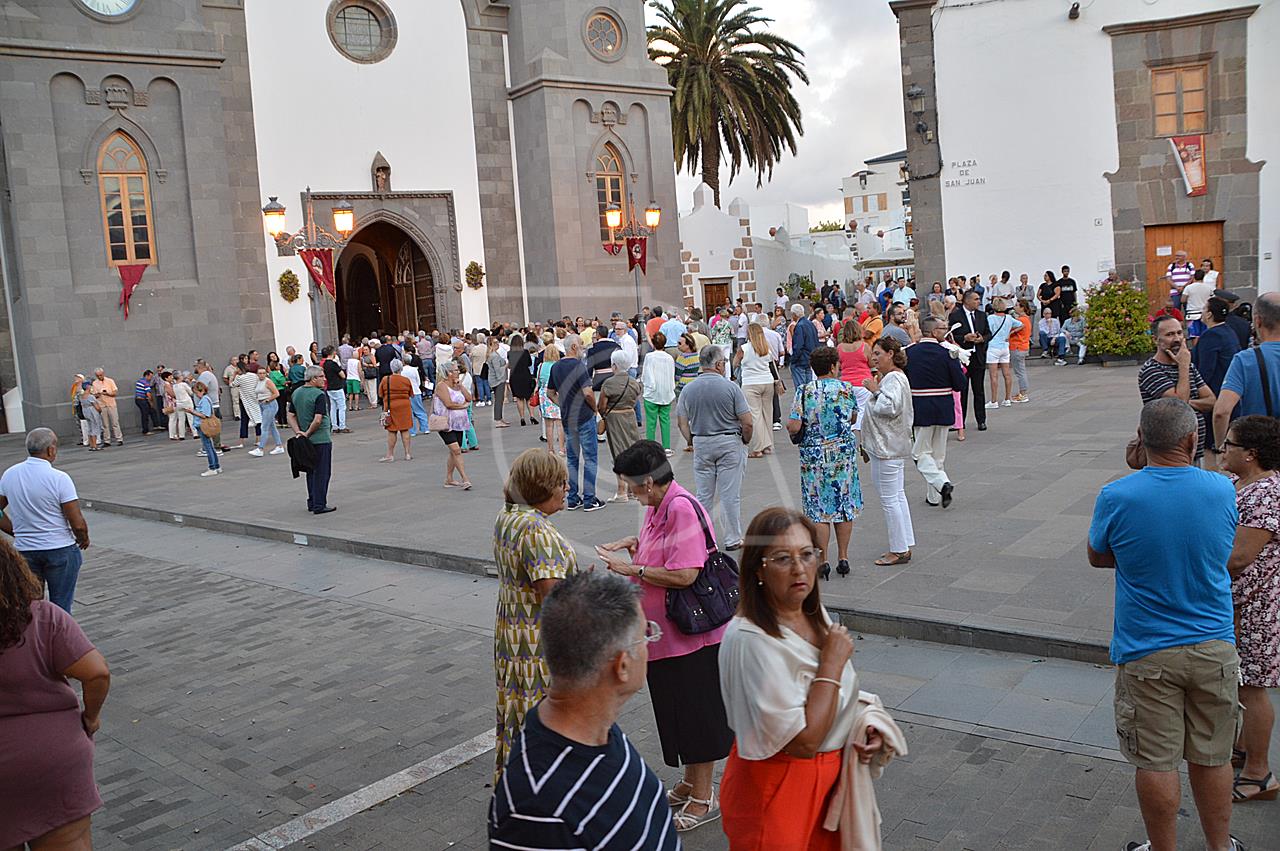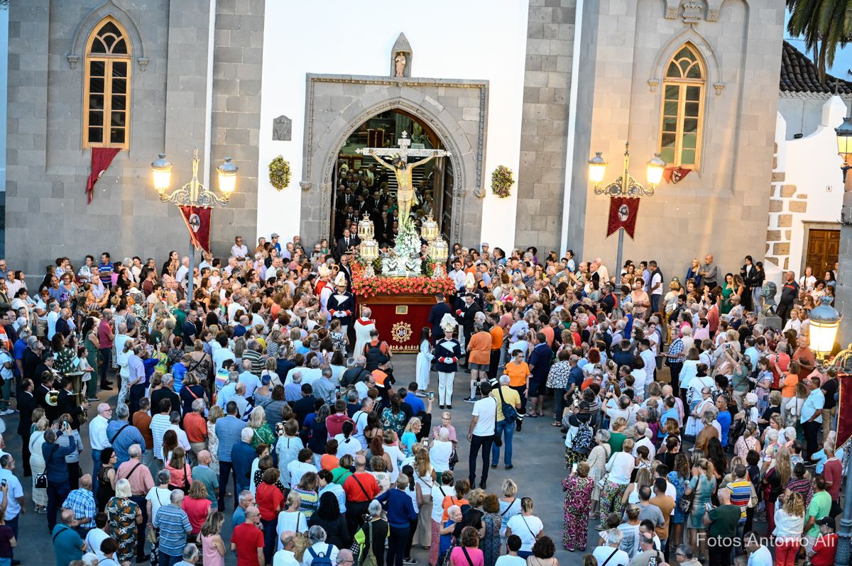 Tras la eucaristía, que estuvo presidida por el obispo de la Diócesis Canariensis, José Mazuelos Pérez, y que comenzó a las 19.00 horas en una abarrotada Basílica de San Juan, la imagen inició el recorrido en su trono, entre vivas y aplausos, sobre las 20.15 horas, con el bastón de mando de la ciudad a los pies de la cruz forrada de plata repujada.