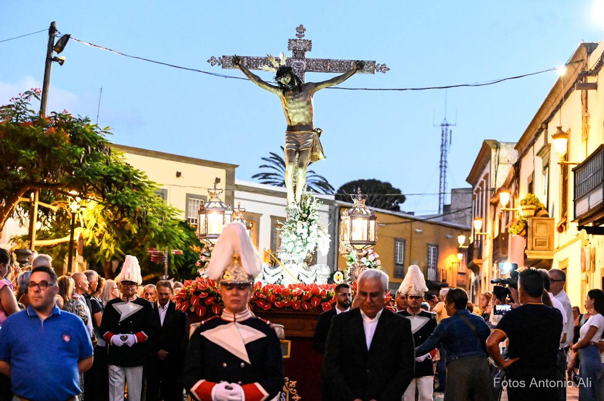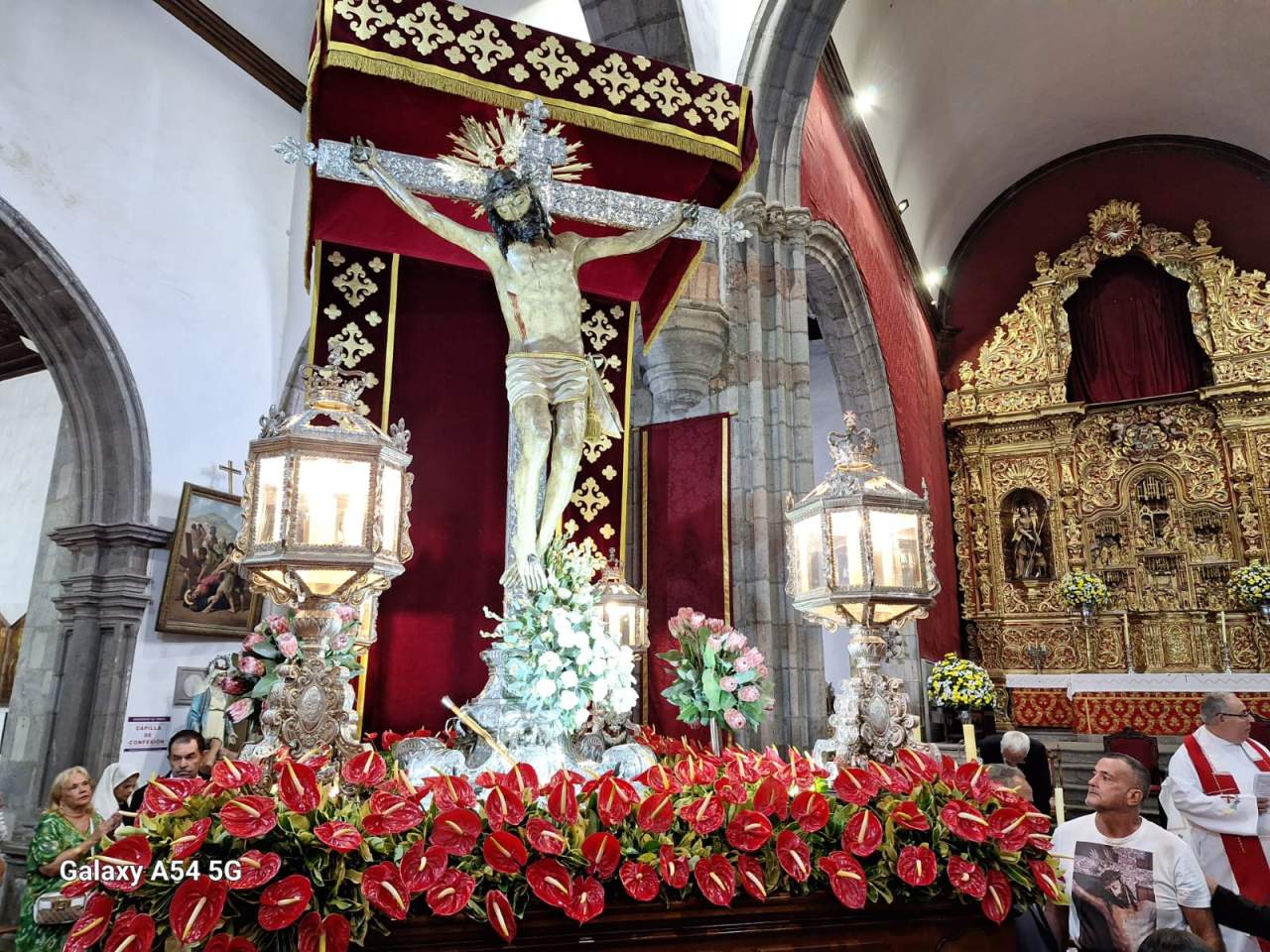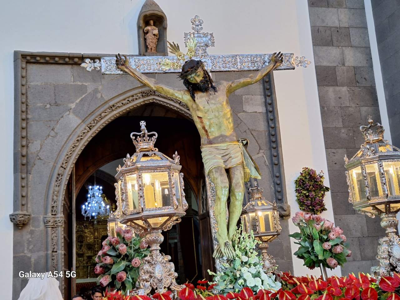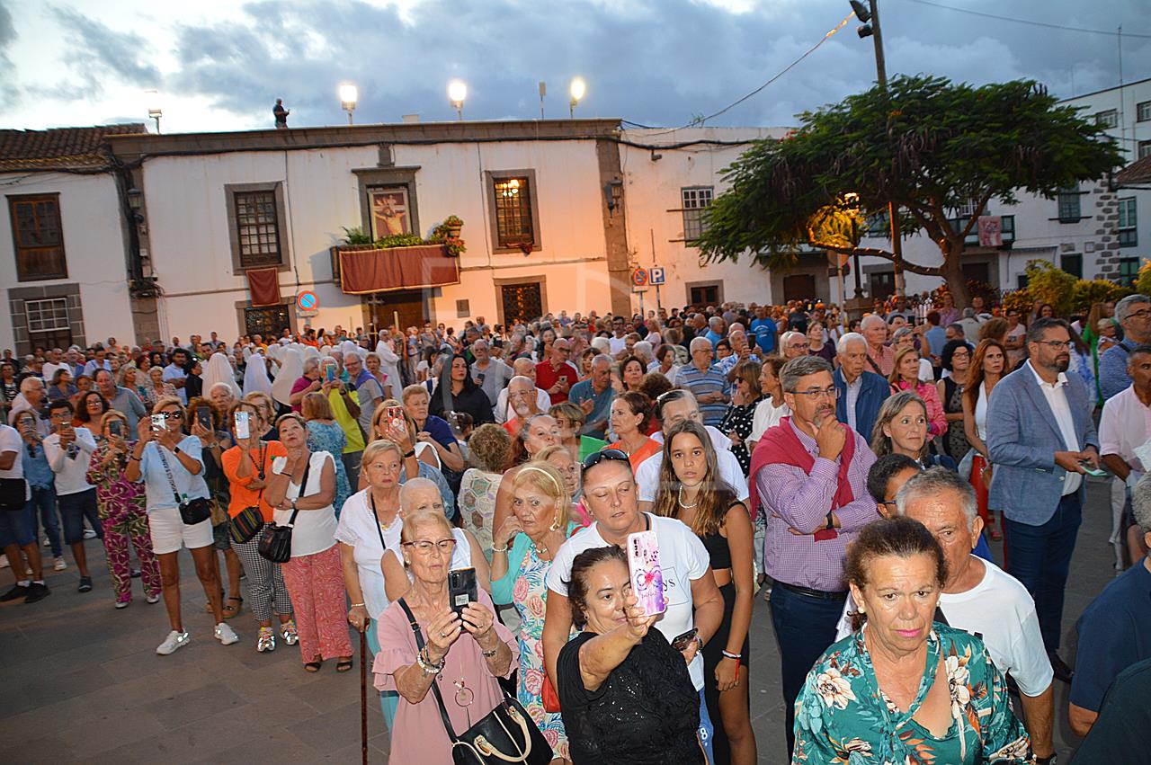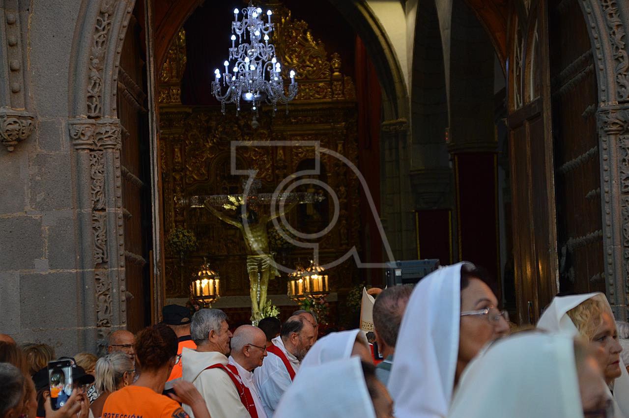 Tras la eucaristía, que estuvo presidida por el obispo de la Diócesis Canariensis, José Mazuelos Pérez, y que comenzó a las 19.00 horas en una abarrotada Basílica de San Juan, la imagen inició el recorrido en su trono, entre vivas y aplausos, sobre las 20.15 horas, con el bastón de mando de la ciudad a los pies de la cruz forrada de plata repujada.