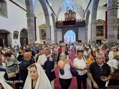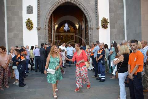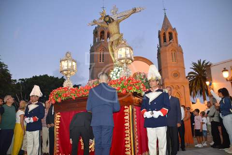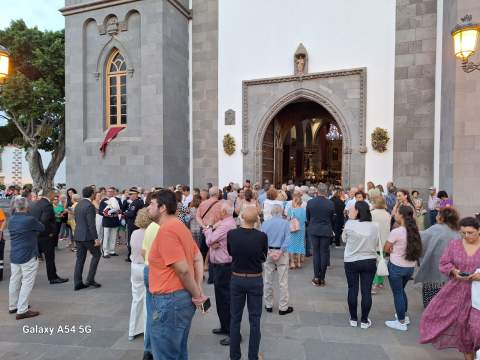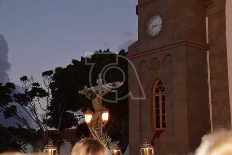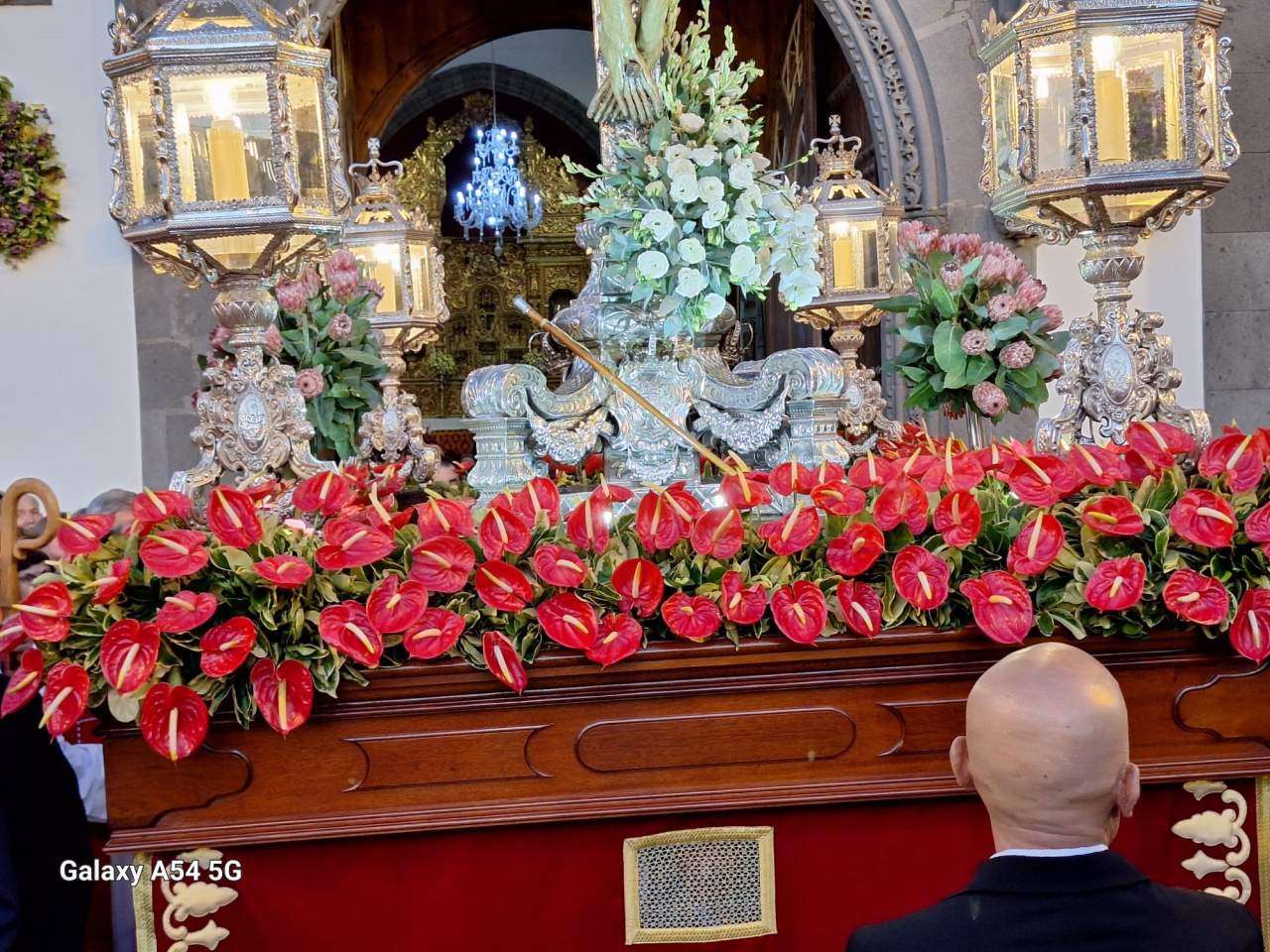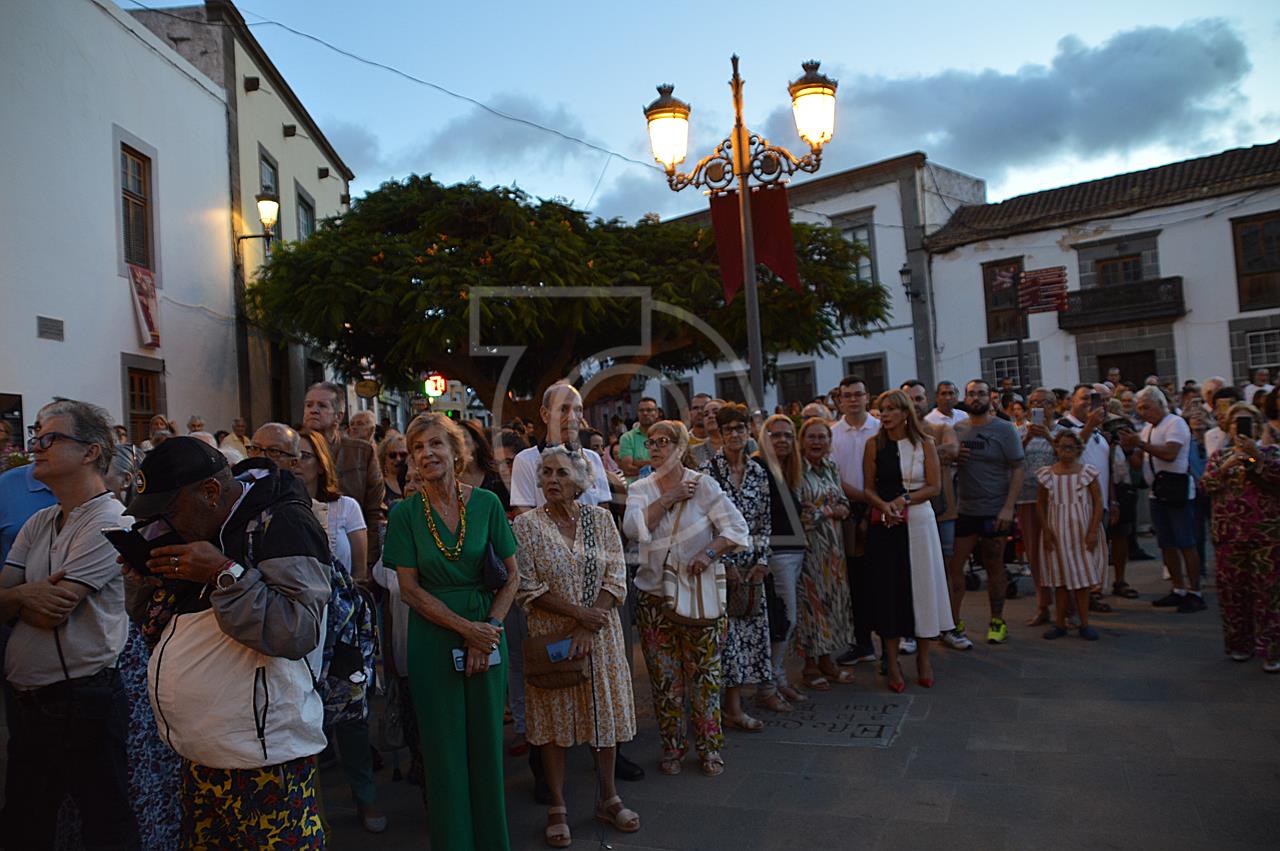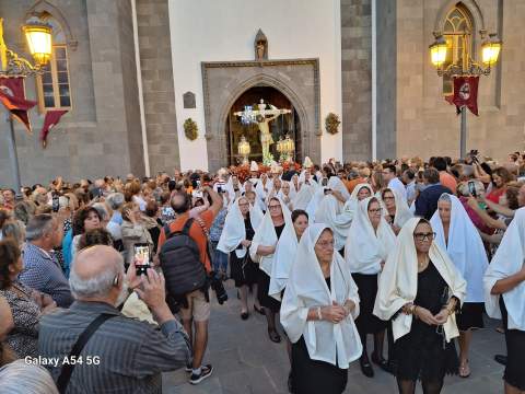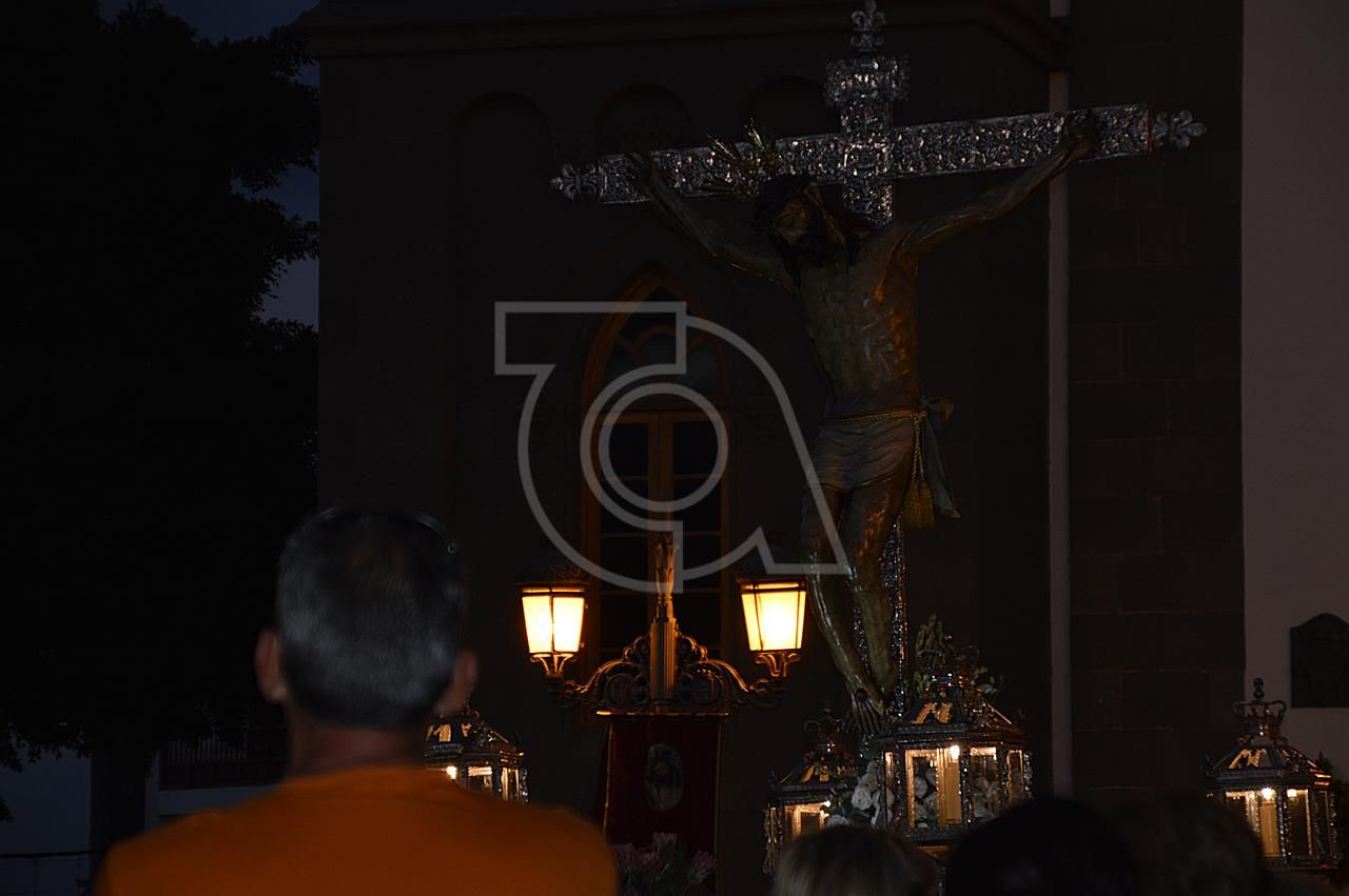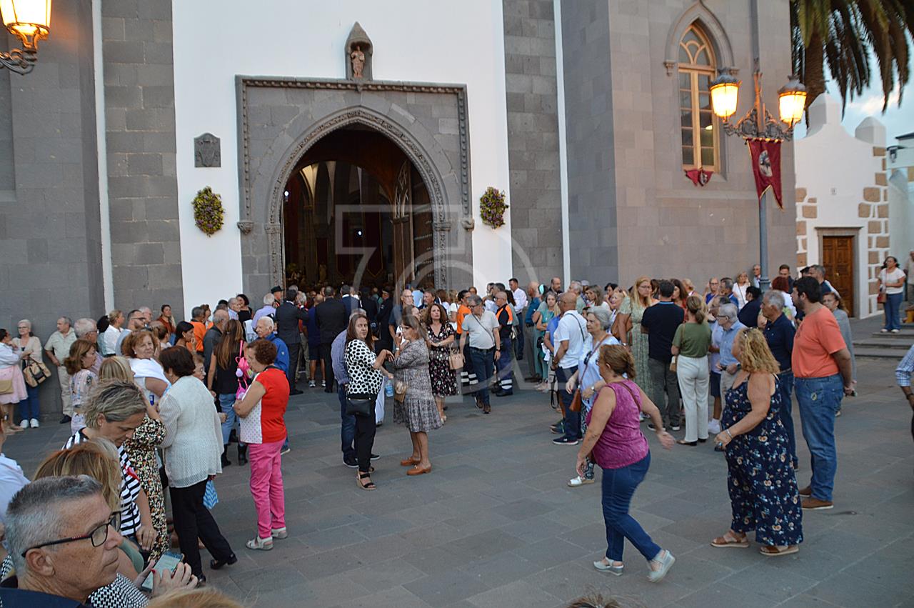Tras la eucaristía, que estuvo presidida por el obispo de la Diócesis Canariensis, José Mazuelos Pérez, y que comenzó a las 19.00 horas en una abarrotada Basílica de San Juan, la imagen inició el recorrido en su trono, entre vivas y aplausos, sobre las 20.15 horas, con el bastón de mando de la ciudad a los pies de la cruz forrada de plata repujada.