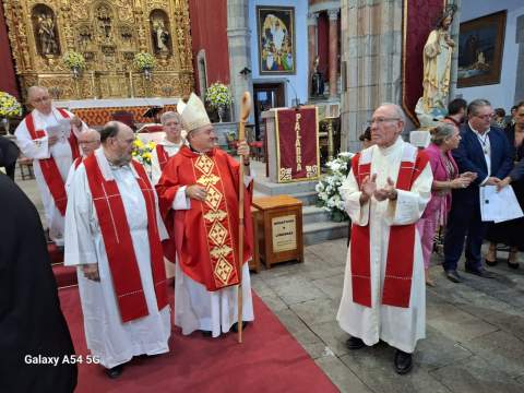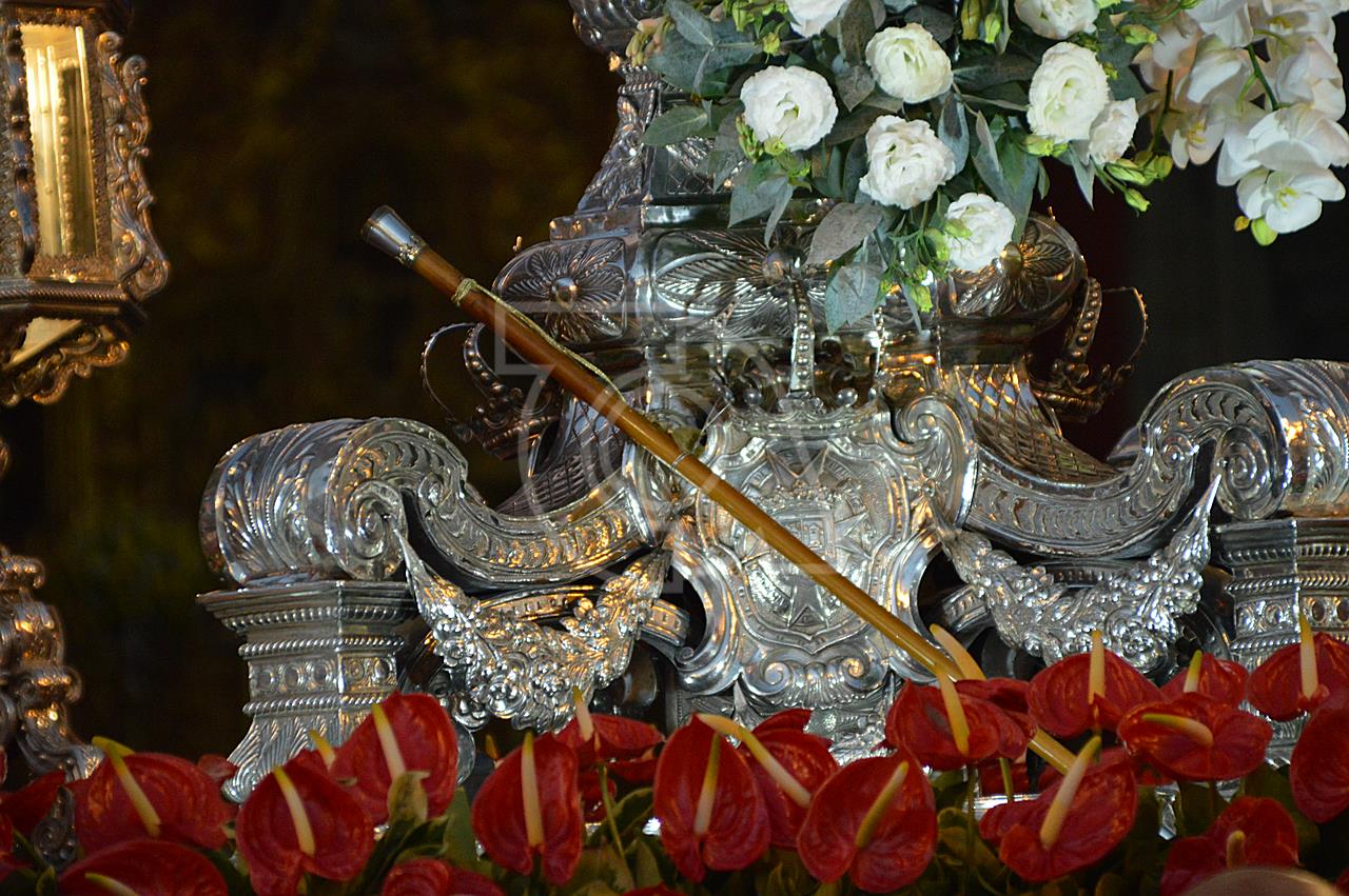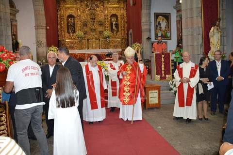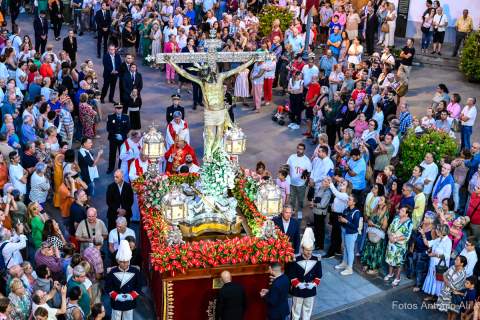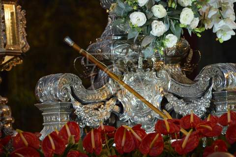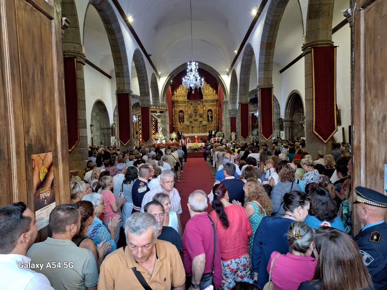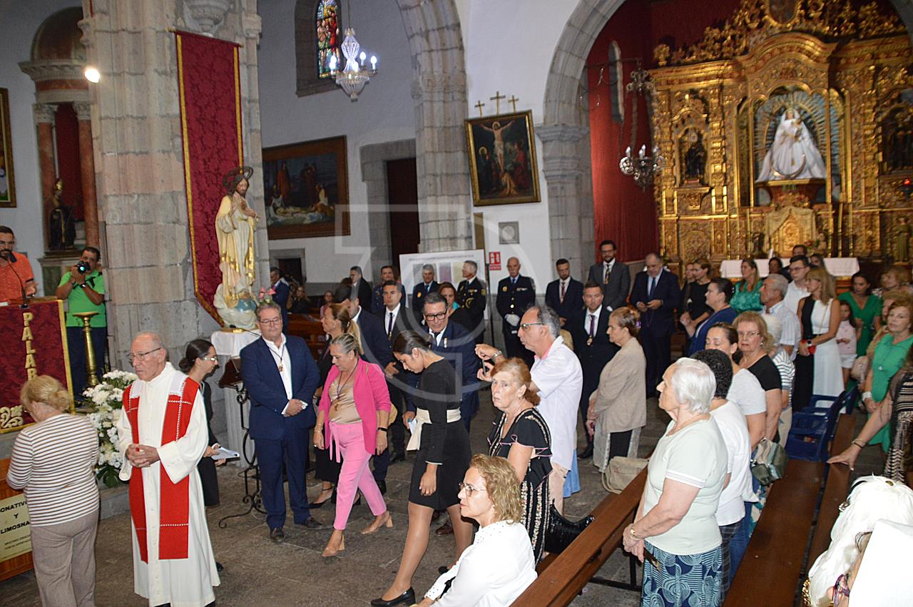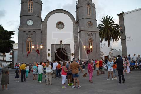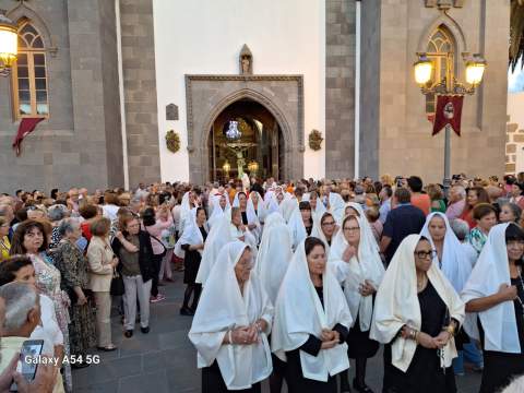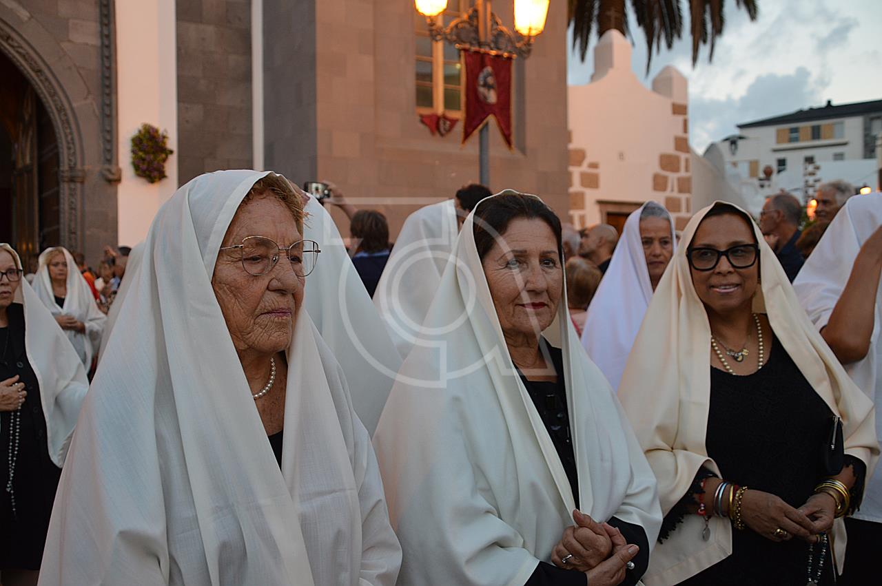 Tras la eucaristía, que estuvo presidida por el obispo de la Diócesis Canariensis, José Mazuelos Pérez, y que comenzó a las 19.00 horas en una abarrotada Basílica de San Juan, la imagen inició el recorrido en su trono, entre vivas y aplausos, sobre las 20.15 horas, con el bastón de mando de la ciudad a los pies de la cruz forrada de plata repujada.