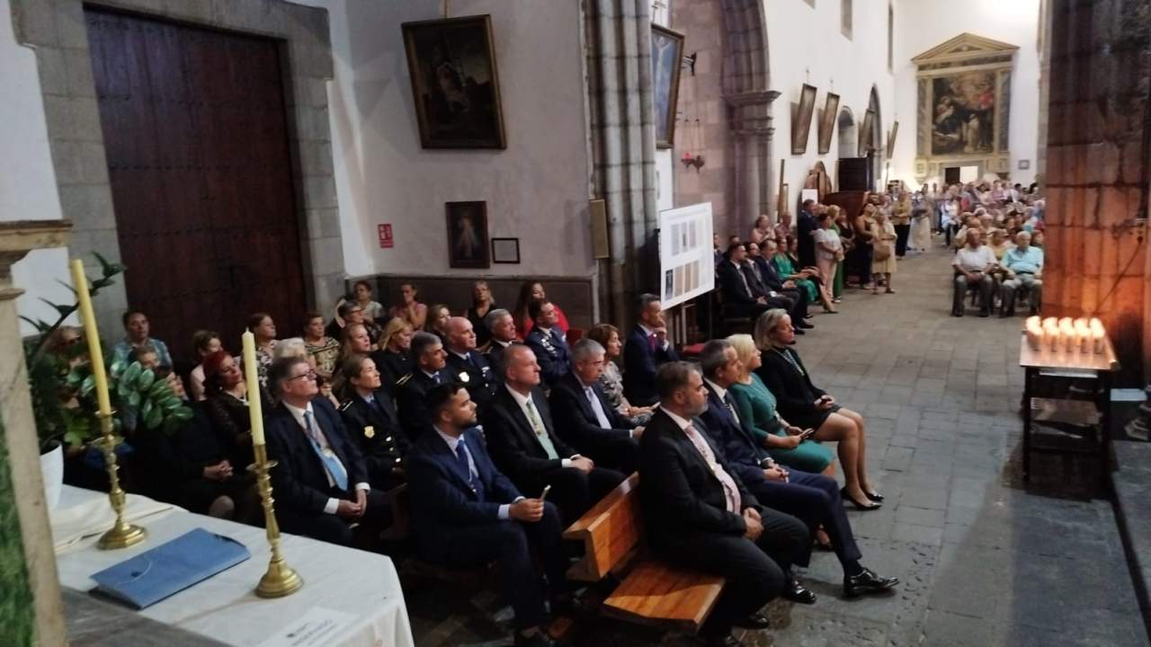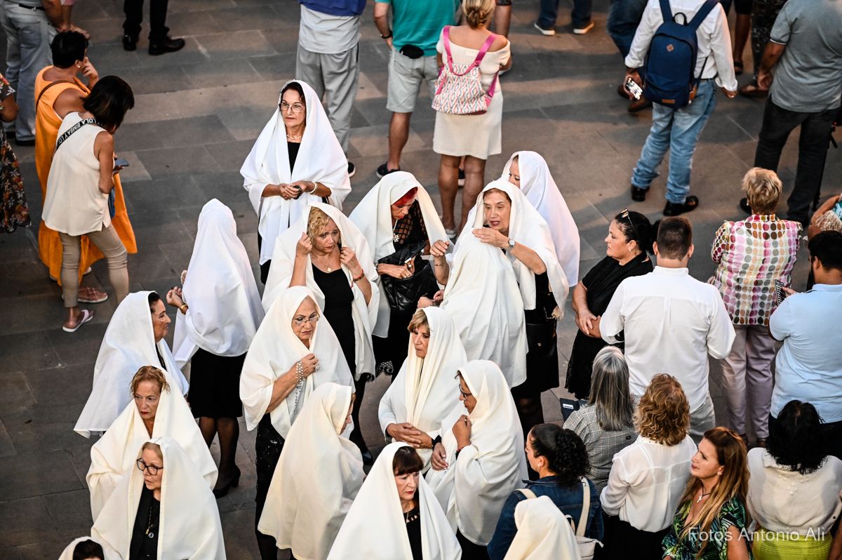 Y lo hizo acompañada por los acordes del Himno Nacional interpretado por la Banda Municipal de Música, escoltada por miembros de la Policía Local con su traje de gala y precedida por un grupo de mujeres con la mantilla canaria.