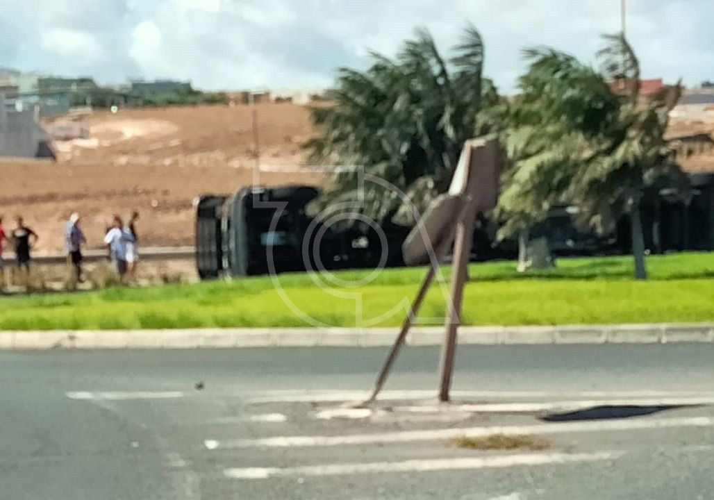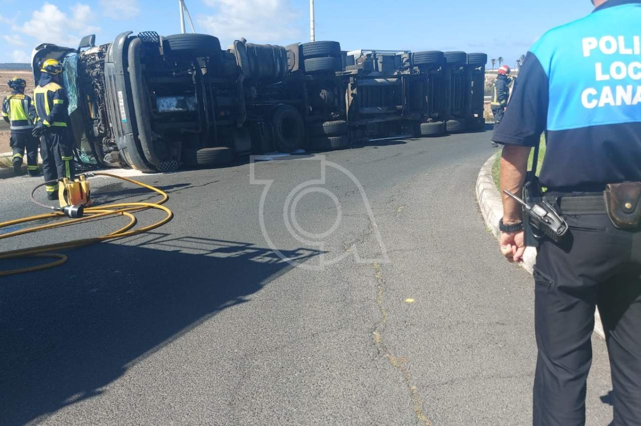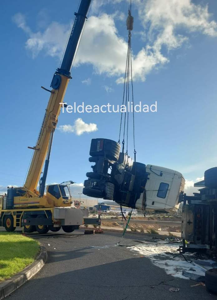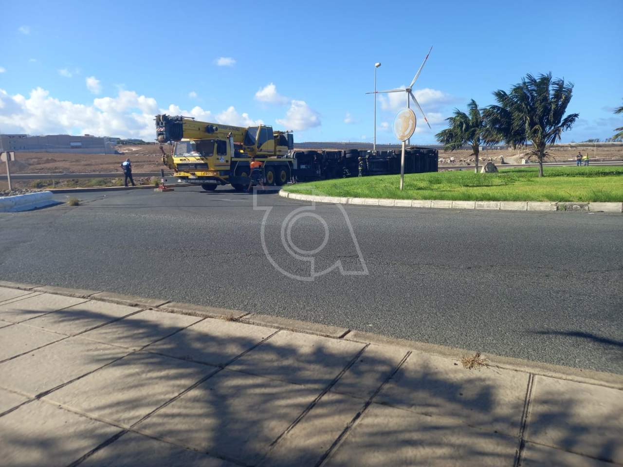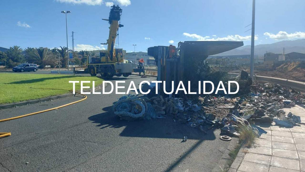 El siniestro ocurrió sobre las 16.30 horas en el vial costero de Telde. El conductor se adentró en la rotonda próxima a la calle Labrador, junto al supermercado Mercadona y a las instalaciones de Disa. Por causas que se desconocen, el vehículo, un camión articulado que iba cargado de chatarra, volcó lateralmente sobre el costado derecho.