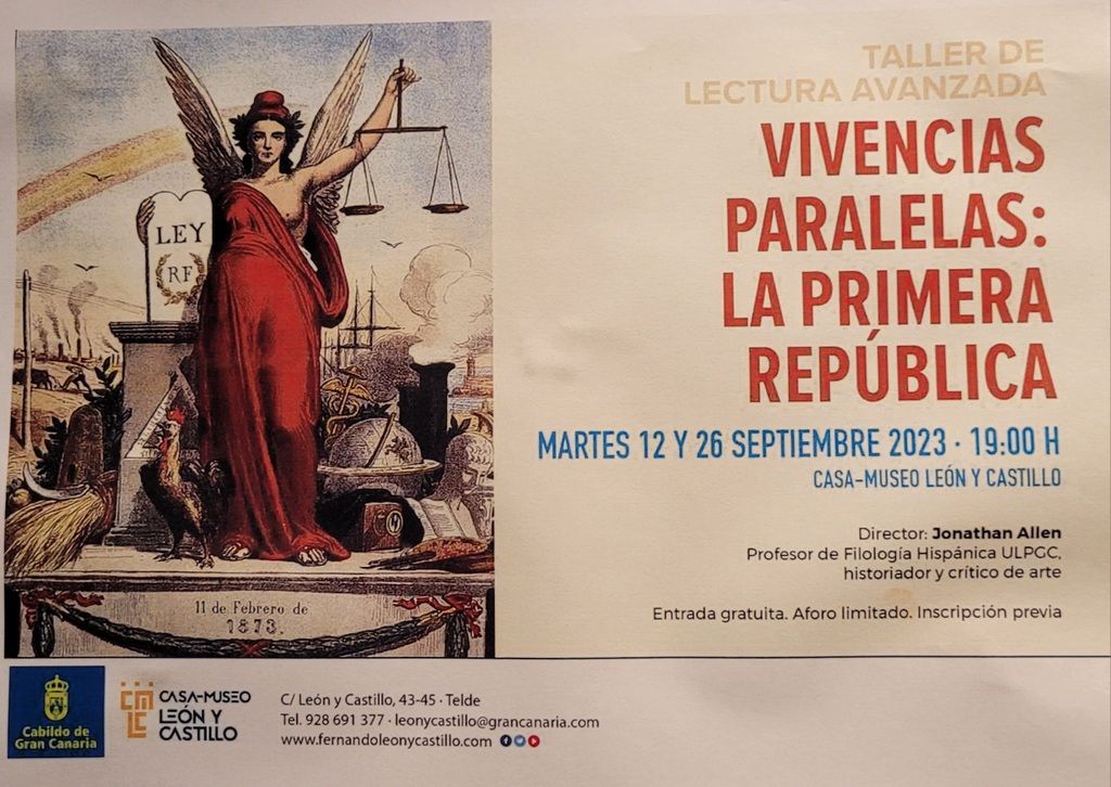 Después del paréntesis del largo y cálido verano por el que aún transitamos retomamos los caminos del ciclo Vivencias Paralelas que se desarrolla e imparte en el taller de lectura avanzada en la Casa Museo León y Castillo de Telde, institución museística que dirige Frank González dependiente de la Consejería de Cultura del Cabildo de Gran Canaria. El ciclo está dirigido y coordinado por Jonathan Allen, profesor de Filología Hispánica de la ULPGC, historiador y crítico de arte, iniciando esta nueva cita con la historia y la obra de Galdós la tarde del martes 12, con la primera lectura, debate y reflexión a partir de la Primera República y los acontecimientos que en aquel contexto histórico y social se sucedieron.