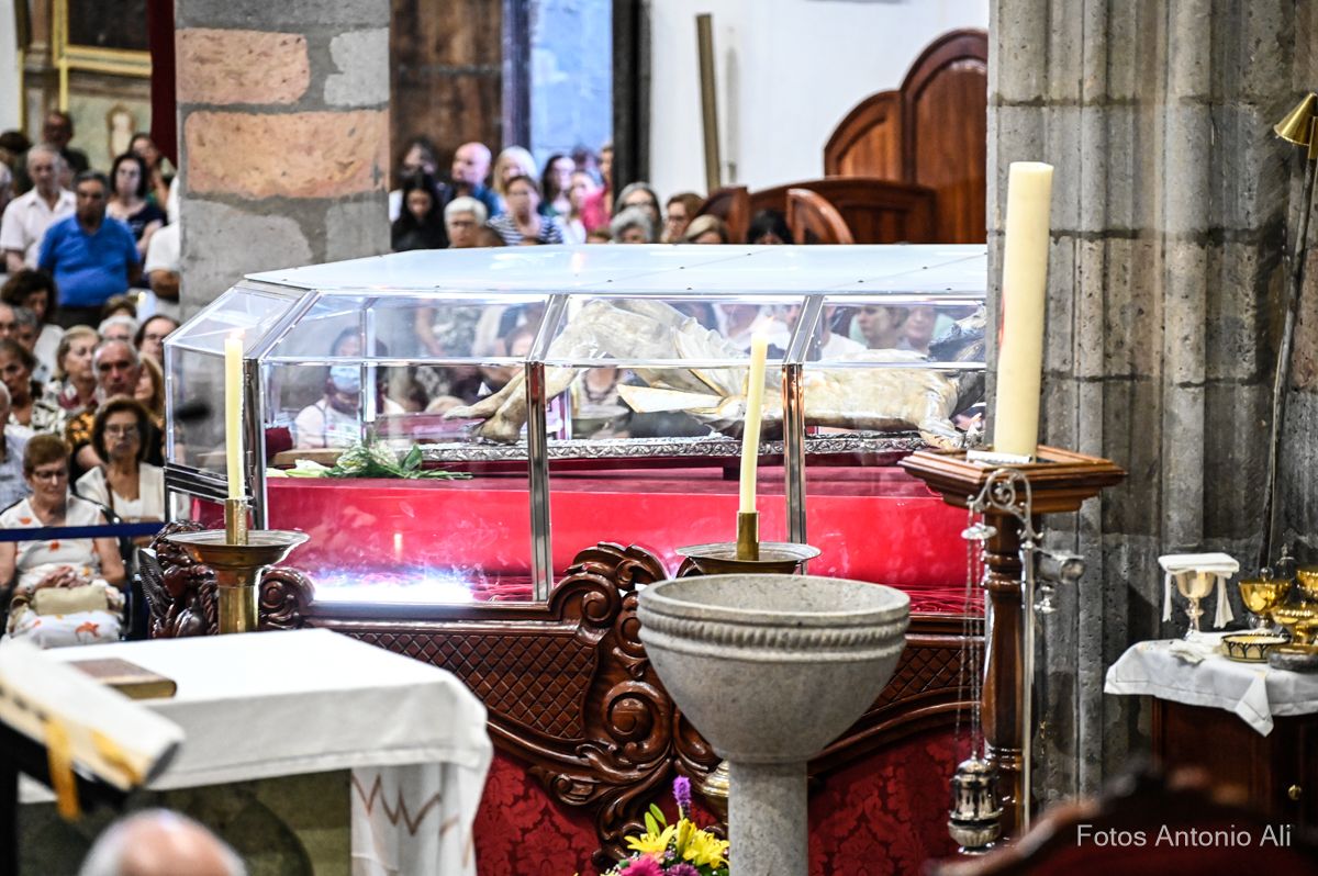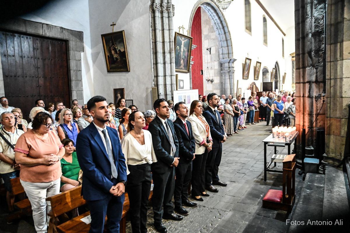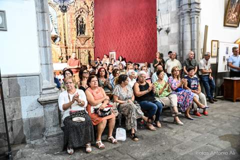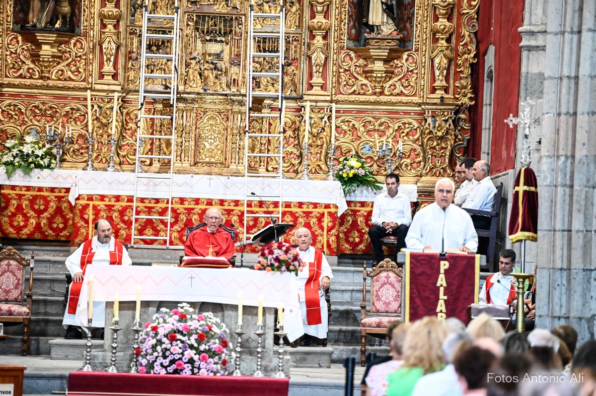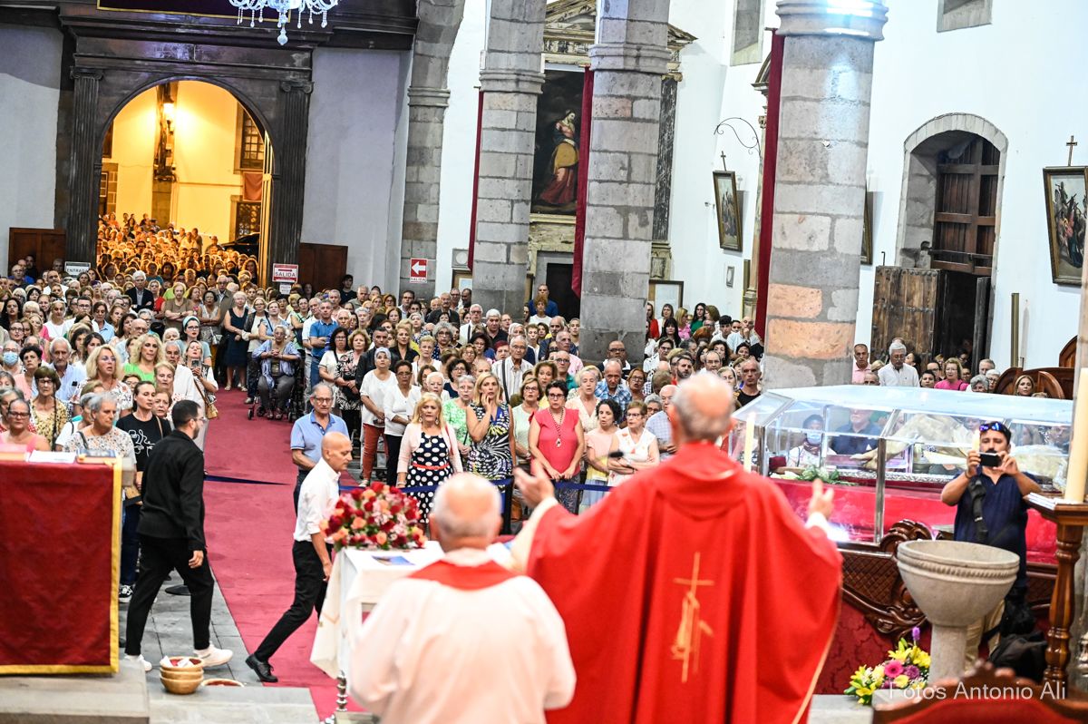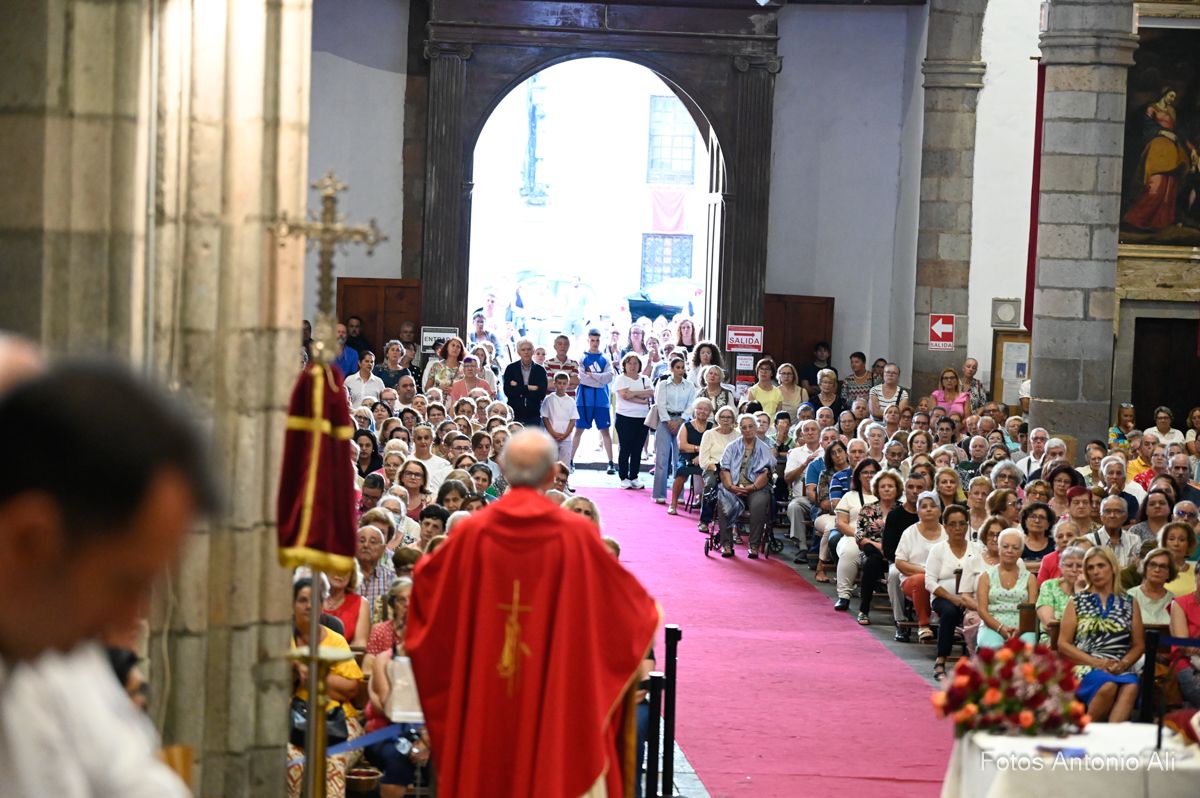 El acto de la Subida comenzó al finalizar la eucaristía que ofició el párroco titular José María Cabrera con el acompañamiento de siete sacerdotes más, en un templo matriz abarrotado de personas y con la presencia del alcalde de Telde, Juan Antonio Peña, y miembros de la Corporación local.
