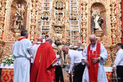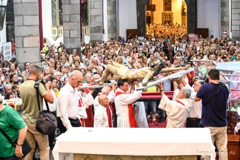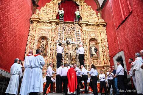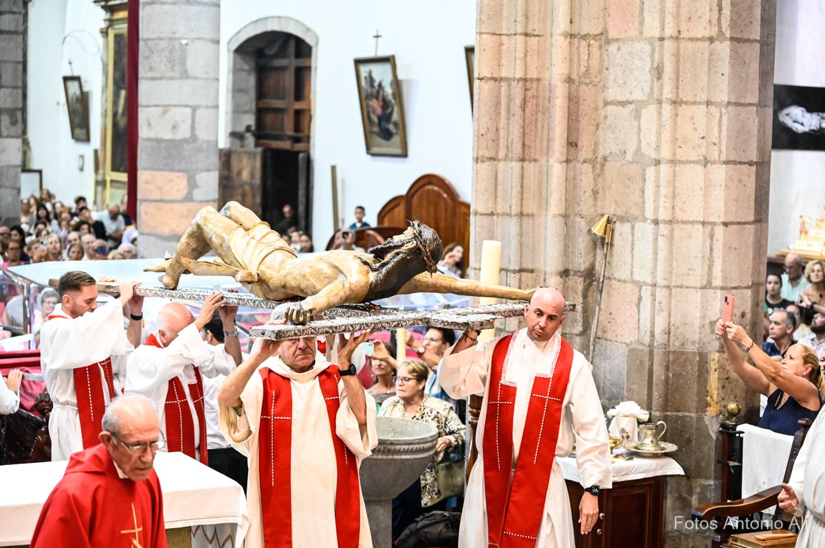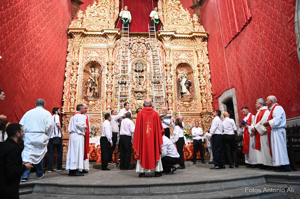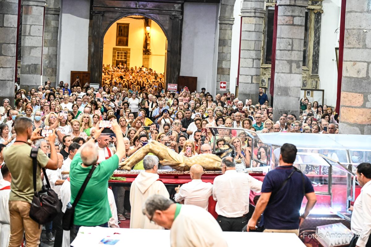 El Santo Cristo de Telde regresó en la noche de este viernes a la horcina superior del Altar Mayor de la Basílica de San Juan, como cada 22 de septiembre, durante la tradicional ceremonia de Subida que puso fin a más de 10 días de festejos en su honor.