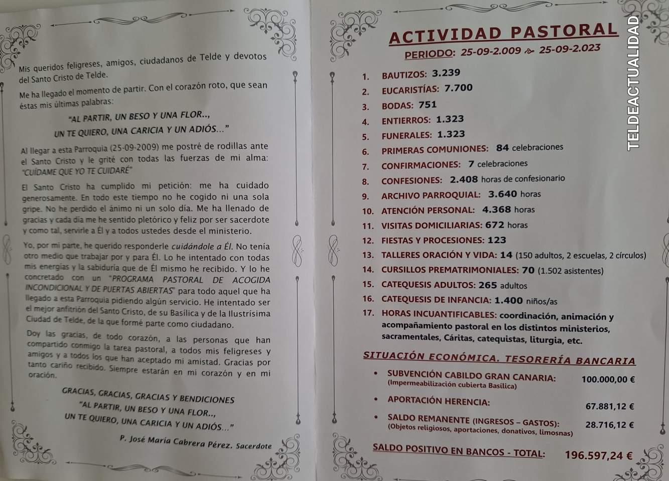Al finalizar la misa, el equipo de colaboradores de la parroquia repartió entre los feligreses un díptico a tdodo color con un texto de agradecimiento de José María Cabrera e información estadística de su actividad pastoral durante estos 14 años en Telde y de la situación económica de la parroquia, que arroja un saldo positivo en los bancos de casi 200.000 euros, contando una subvención de 100.000 euros del Cabildo grancanario para el proyecto de impermeabilización de la cubierta de la Basílica de San Jua.