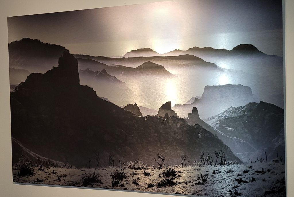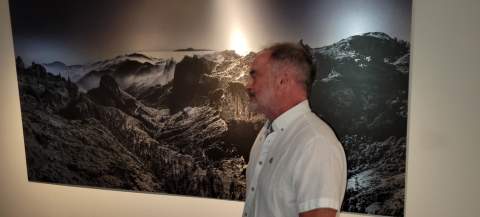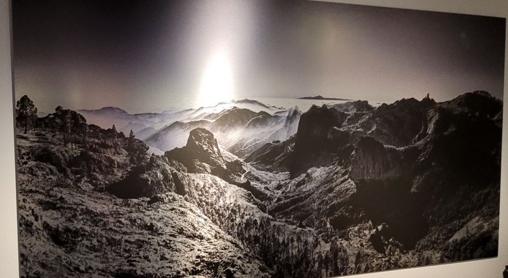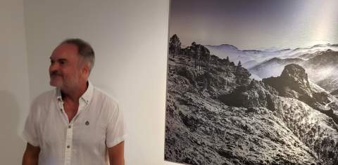 En esta exposición recorremos por su docena de fotografías de gran formato en blanco y negro, de su mano y mirada los perfiles y rincones cumbreros para, con su ingenio creativo fotográfico, llevarnos por los misterios geológicos de la piel de la isla que como un libro abierto capta las mejores páginas de la historia de un paisaje vivo, que respira atravesado por nubes, brumas, sombras, arboledas, barrancos y sus profundidades, nocturnidad bajo la inmensidad del Cosmos y la grandeza de cielos limpios, cercados por litorales de mar y sal, bajo los efectos naturales de un alisio protector de la propia naturaleza insular atlántica canaria.