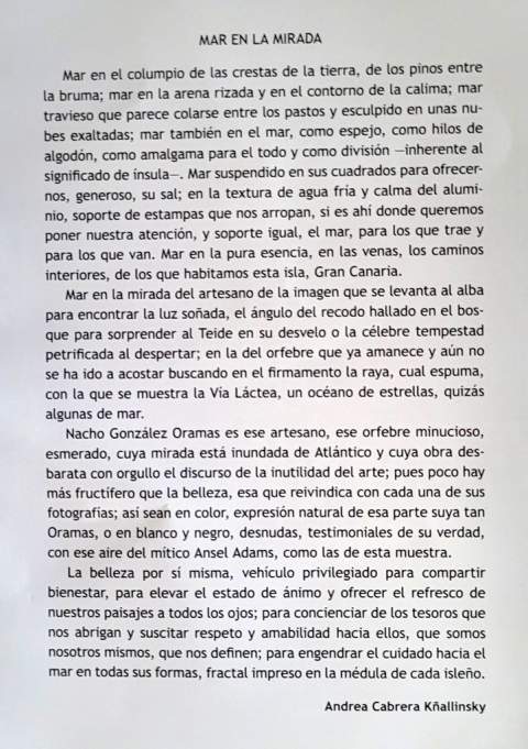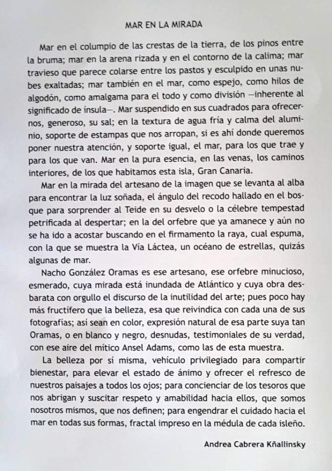 “Mar es la mirada del artesano de la imagen que se levanta al alba para encontrar la luz soñada, el ángulo del recodo hallado en el bosque para sorprender al Teide en su desvelo o la célebre tempestad petrificada al despertar; en la del orfebre que ya amanece y aún no se ha ido a acostar buscando en el firmamento la raya, cual espuma, con la que se muestra la Vía Láctea, un océano de estrellas, quizás algunas de mar.