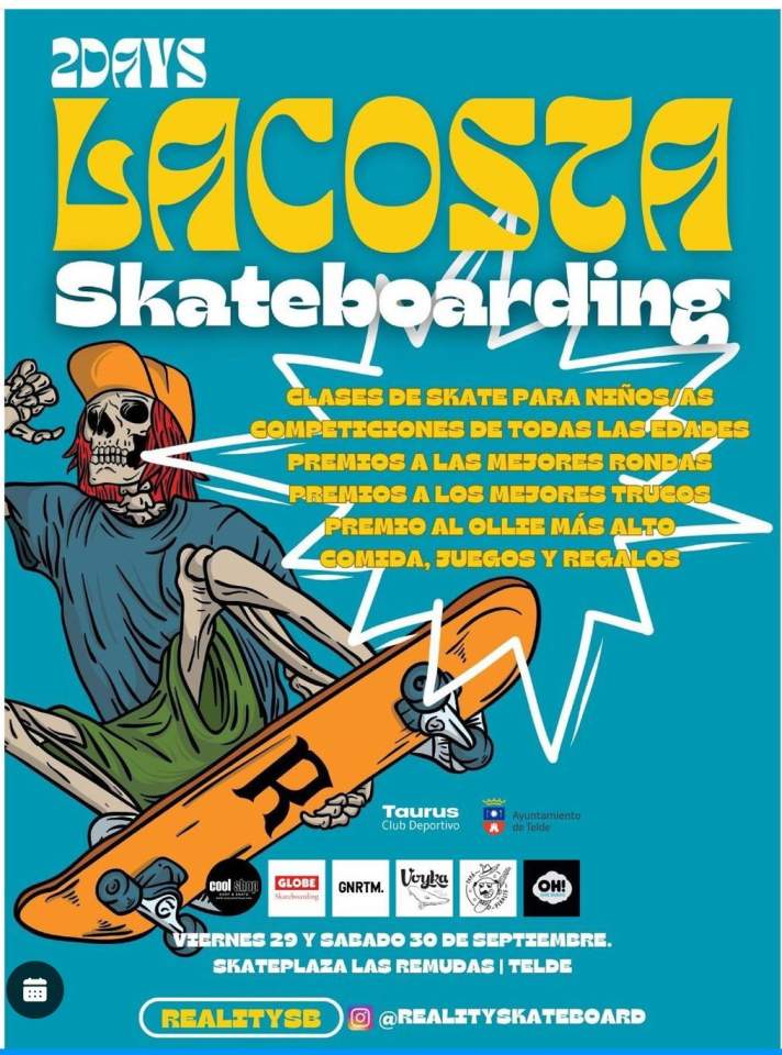 El barrio teldense de Las Remudas acogerá los próximos días 29 y 30 de septiembre el Lacosta Skateboarding, un evento bajo la organización del Club Deportivo Taurus y que contará con la colaboración de la Concejalía de Actividad Física y Deportes del Ayuntamiento de Telde, que coordina Cristhian Santana Caballero.
