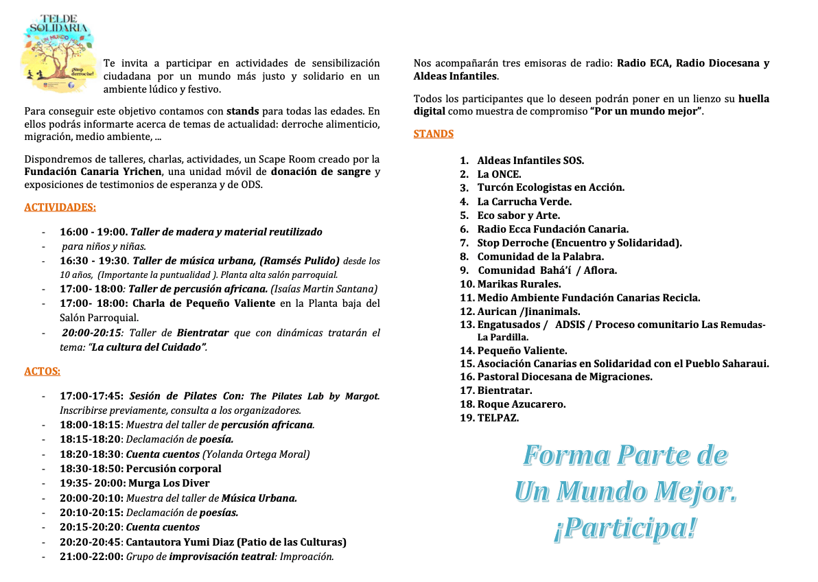 Bajo el lema Telde solidaria, educando en valores por un mundo mejor. ¡Stop derroche!, la iniciativa pretende visibilizar la importancia de la solidaridad a través de la exposición del día a día y de los proyectos que cada una de las agrupaciones participantes llevan a cabo con el objetivo de mejorar la vida de las personas. Así, se instalarán unas 20 carpas en las que explicarán a los asistentes el trabajo que desempeñan y donde ofrecerán multitud de actividades, talleres, exposiciones y actuaciones, entre otros.