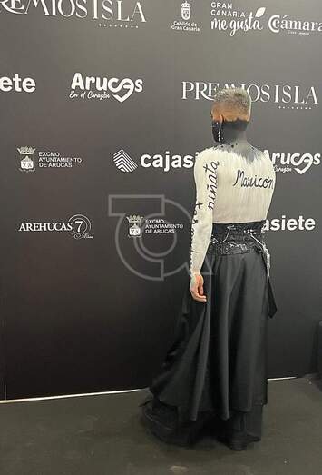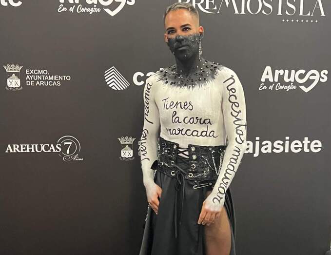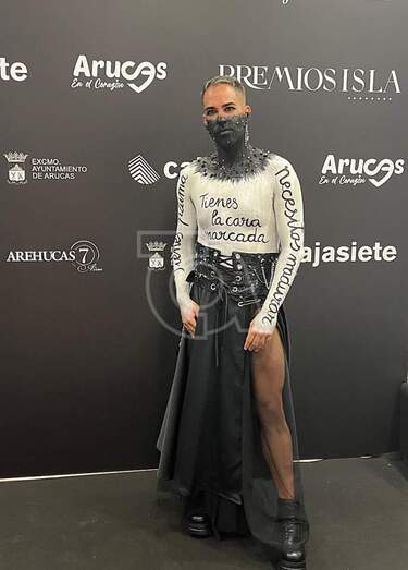 Adolfo, que ha estado cara a cara con Pablo López, Lola Índigo, Manuel Turizo, Tini Stoessel, Álvaro de Luna o, por ejemplo, con los actores turcos Can Yaman y Kerem Bursin, apostó por un arriesgado diseño del palmero Pedro Juan González y el también teldense Nauzet Afonso, quien puso el toque de color, con el que quiso lanzar un mensaje al mundo, según sus propias palabras: “Los usuarios de las redes sociales no me hacen un traje con sus críticas, ya me lo hago yo”.