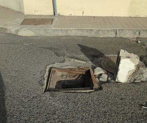 Una peligrosa arqueta sin tapa ubicada en la calle Hibiscus, en La Garita, a punto ha estado de provocar un accidente de tráfico cuando un motorista que circulaba por la zona no pudo evitar pasar por encima de ella. La víctima, que afortunadamente salió ilesa, colocó un bloque justo delante para advertir del peligro.