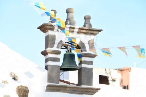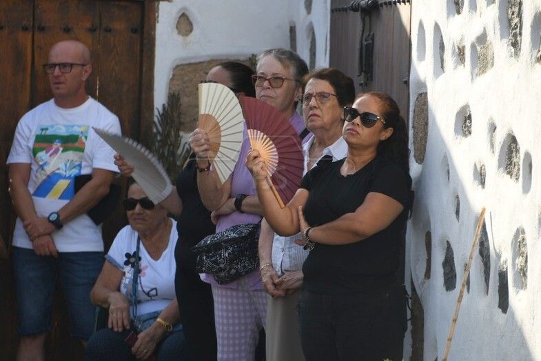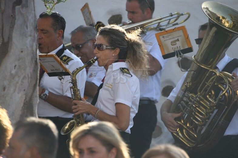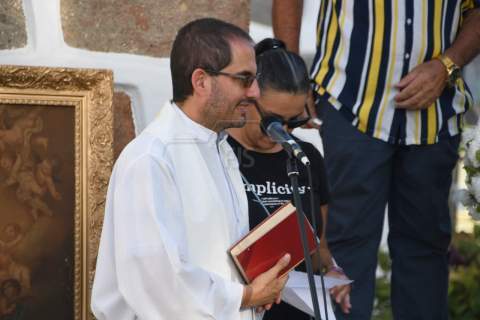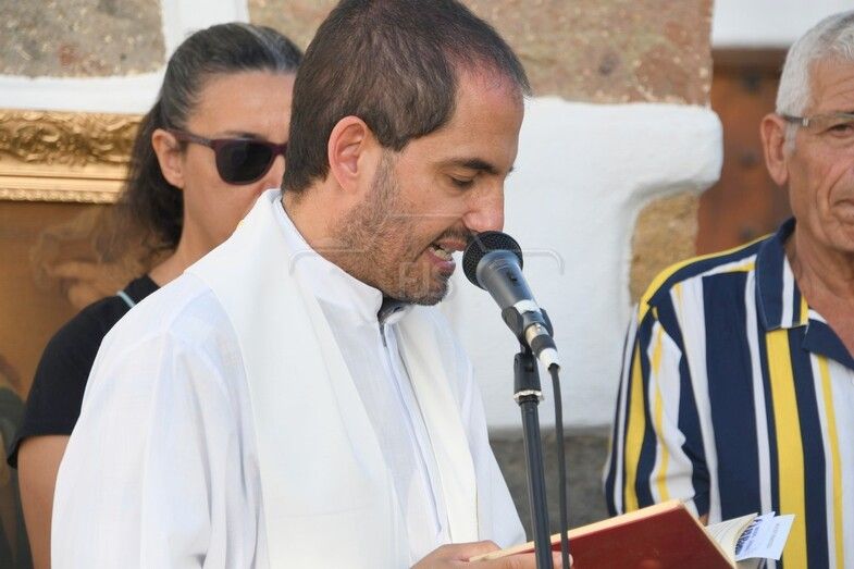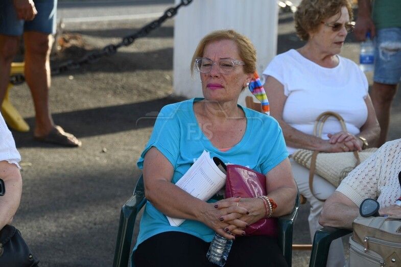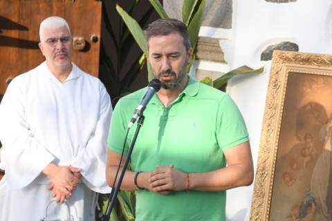 El nuevo párroco de San Juan y de la zona, Antonio Juan López, ofició la lectura de la Palabra y bendijo la escultura de un metro de altura, unos 10 kilos de peso y tallada a principios de año en madera de caoba de Nicaragua por Francisco Martín, empresario y ebanista de 80 años de la localidad sevillana de Écija, por encargo de Juan Diego Falcón.