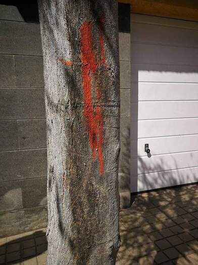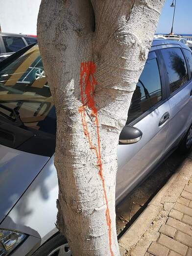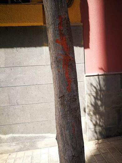 En los últimos días, en las calles  La Pinta y Cristóbal Colón, han aparecido en algunos árboles un poco resecos ( no he visto nunca regarlos,) y otros aún florecientes, unas marcas con pintura roja, señal de que los van a talar o algo similar.