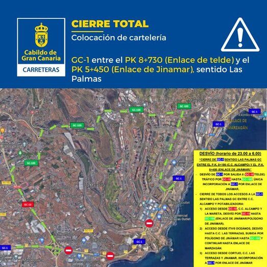 El Servicio de Carreteras del Cabildo de Gran Canaria anuncia el cierre total de la GC-1, entre La Mareta y la potabilizadora, para la colocación de cartelería. Los cortes de tráfico se realizarán desde el próximo lunes y hasta la finalización de los trabajos, de 23.00 a 6.00 horas, en dirección a Las Palmas de Gran Canaria.