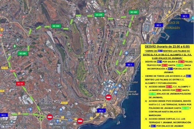 El tráfico será desviado por la GC-10 (Avenida del Cabildo) y la GC-100 (antigua carretera de Jinámar), por lo que la única incorporación a la GC-1 se realizará en el enlace de Jinámar. Asimismo, también estarán cerrados los accesos desde La Mareta, desde la ITV/5 Océanos de La Pardilla y desde El Cortijo, Las Terrazas y Jinámar.