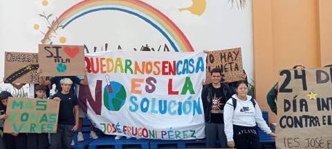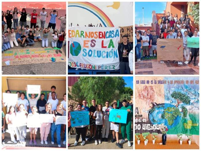 Siete centros de Secundaria de Telde (IES La Herradura, Guillermina Brito, La Rocha, Arnao, Arencibia Gil, Casas Nuevas y El Calero)  realizaron este martes por el Día Internacional contra el Cambio Climático diferentes acciones dentro de cada centro bajo un lema común: ‘Quedarse en casa no es la solución’ con el objetivo de llamar la atención sobre lo que supone un incremento de 2ºC de la temperatura media global.