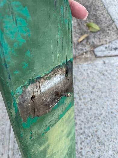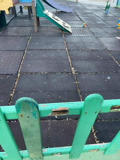 Explican que las barandillas que rodean el espacio de juego se caen ya que las maderas están podridas y se quedan los tornillos sobresaliendo.