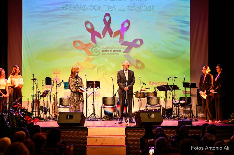 La gala benéfica Arucas contra el Cáncer se celebró este viernes por la noche en el Teatro Viejo de la ciudad del norte de Gran Canaria. Un evento extraordinario que contó con la participación de más de 300 personas en apoyo a la Asociación Española contra el Cáncer.