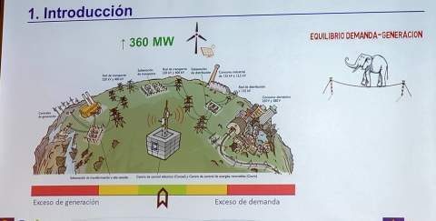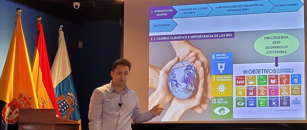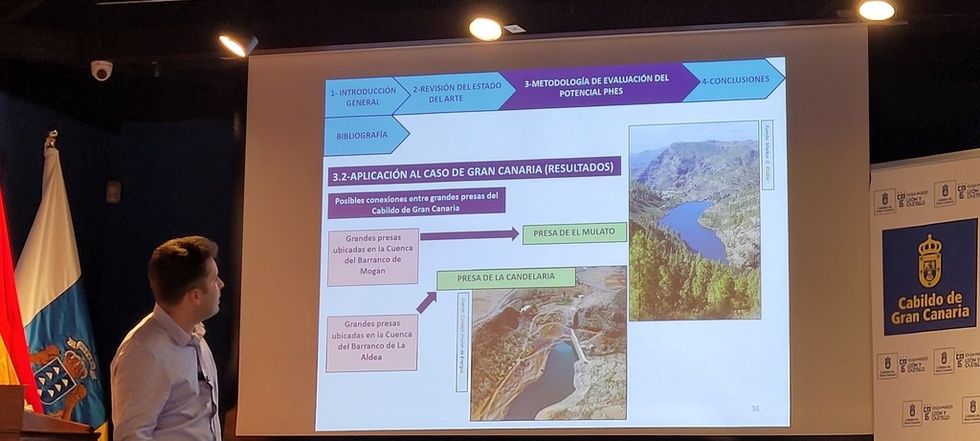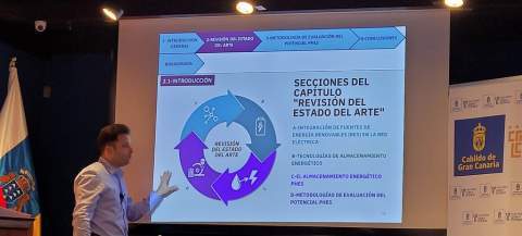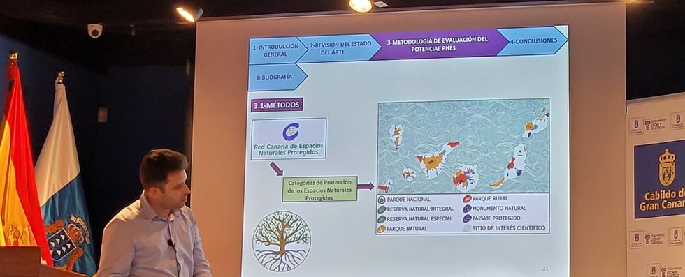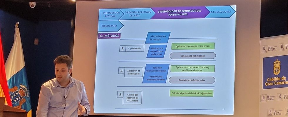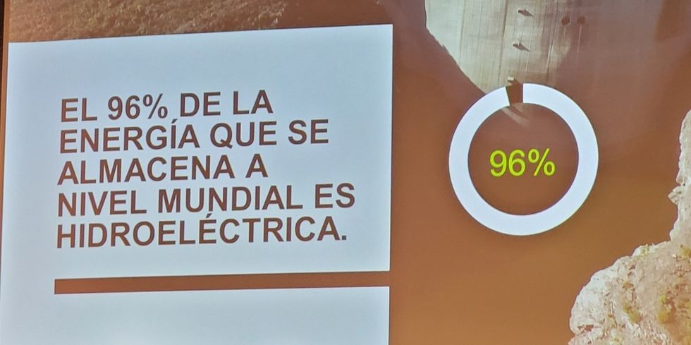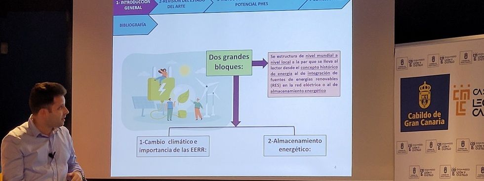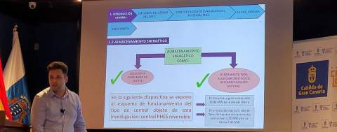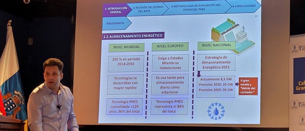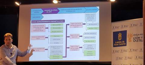 Torres Herrera mediante imágenes proyectadas explica el funcionamiento de una Central Hidroeléctrica reversible PHES. A nivel mundial se espera que el 200 % del almacenamiento energético entre el 2014 y el 2050 las tecnologías se desarrollan con mayor rapidez. A nivel mundial la tecnología de bombeo hidráulico está consolidada desde hace 120 años y representa a día de hoy el 96% del total del almacenamiento energético en el mundo. A nivel europeo representa el 88% del total. En España se aprobó una estrategia de almacenamiento energético en 2021 consiguiendo actualmente 8.3 GW de almacenamiento, con la previsión de que en 2030 se alcancen 20 GW y en 2050, 30 GW. A nivel regional hay una estrategia del gobierno canario en consonancia con el gobierno estatal que en el 2040 hayan 10.45 GWh. Solo 22.80 MW de potencia instalada en El Hierro “Corona del Viento”.
