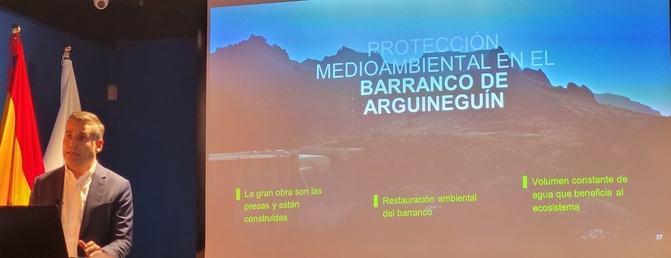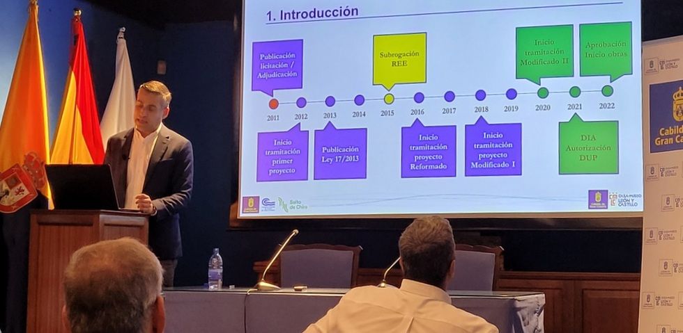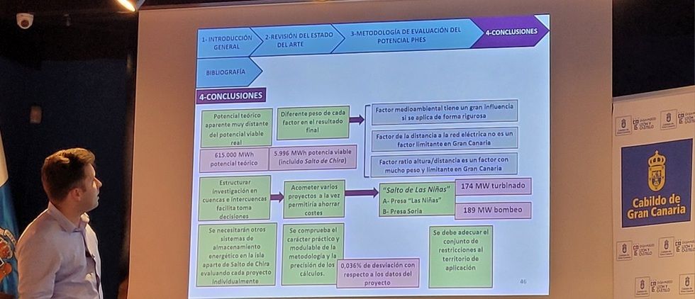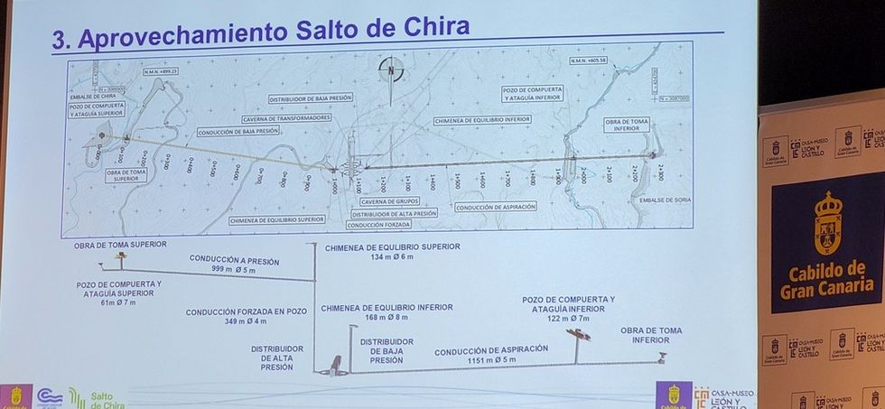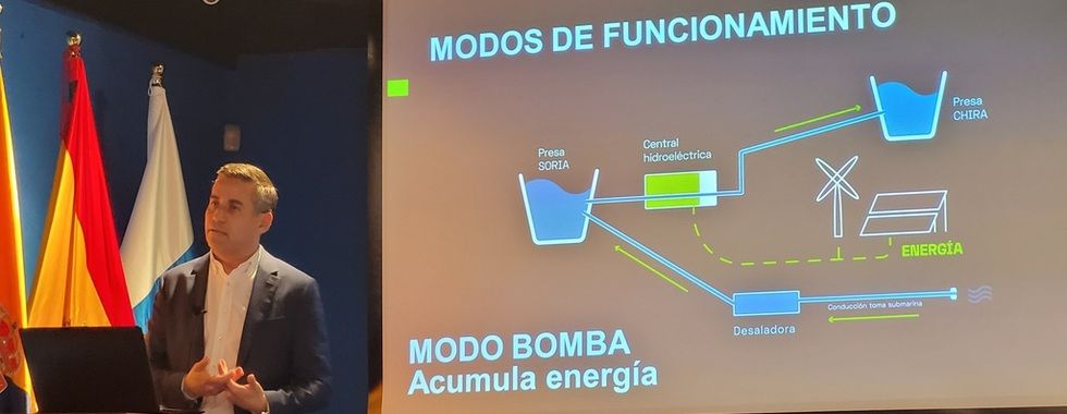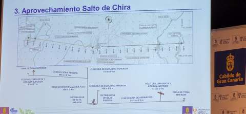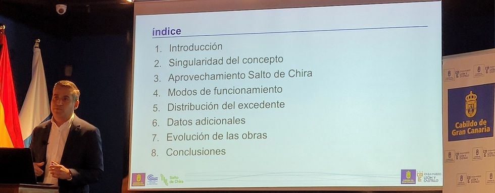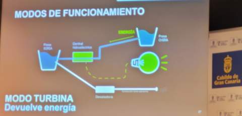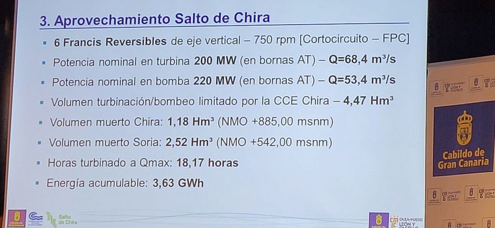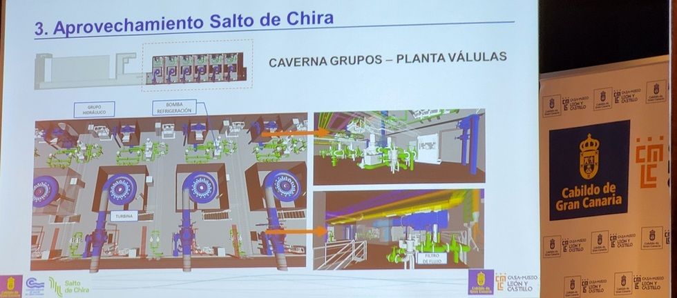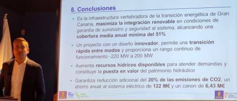 Con la proyección de imágenes del estado de las obras el proyecto es el resultado de una infraestructura vertebradora de la transición energética de Gran Canaria, maximiza la integración renovable en condiciones de garantía de suministro y seguridad al sistema, alcanzado una cobertura media anual mínima del 51%. Un proyecto con un diseño innovador, permite una transición rápida entre modos y proporciona un rango continuo de funcionamiento de 220 MW a 200 MW. Aumenta recursos hídricos disponibles para atender demandas y constituye la puesta en valor del patrimonio hidráulico. Garantiza reducción adicional del 20% de las emisiones de CO2, un ahorro anual al sistema eléctrico de 122 M€ y un canon de 6,43 M€.