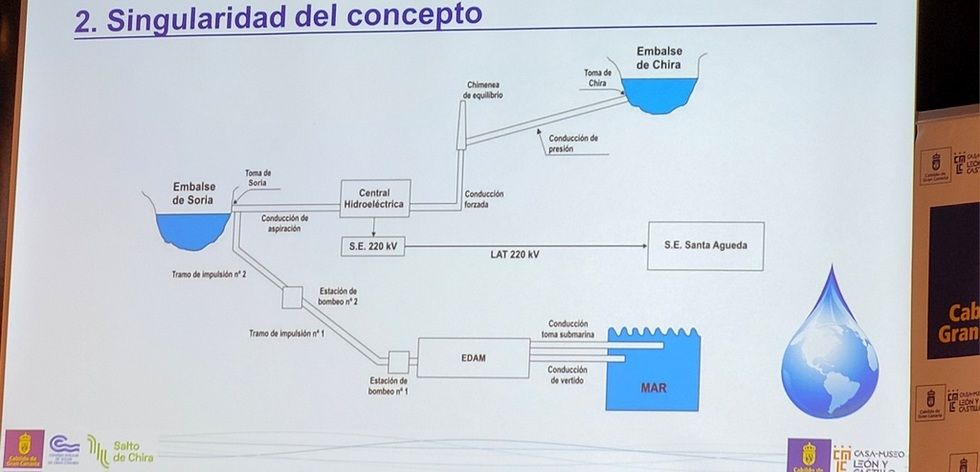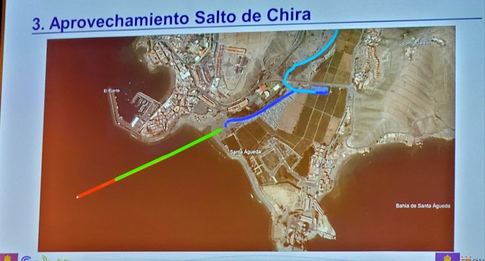 El 96% de la energía que se almacena a nivel mundial es hidroeléctrica. Acometiendo el proyecto del aprovechamiento del Salto de Chira, el proyecto tiene dos zonas principales, dos infraestructuras o elementos principales. El primero de ellos a nivel del mar, el complejo de desalación, infraestructura que capta agua del mar, separa las sales y obtenemos dos tipos de fluidos: un fluido con las necesidades con las que se ha diseñado la planta desaladora para subir el agua hacia el embalse de Soria y otro fluido cargado de sales que hay que devolver al mar a través de un emisario submarino. En el entorno de las presas de Chira y Soria tenemos el aprovechamiento hidroeléctrico en sí, es decir, la conexión hidráulica de esos dos embalses para poder mover el agua entre los dos embalses. Esas dos infraestructuras quedan conectadas por otros dos tendidos: el primero la línea de evacuación de la planta desaladora hacia el embalse, y el segundo la línea de evacuación de la electricidad producida en el aprovechamiento hidroeléctrico.