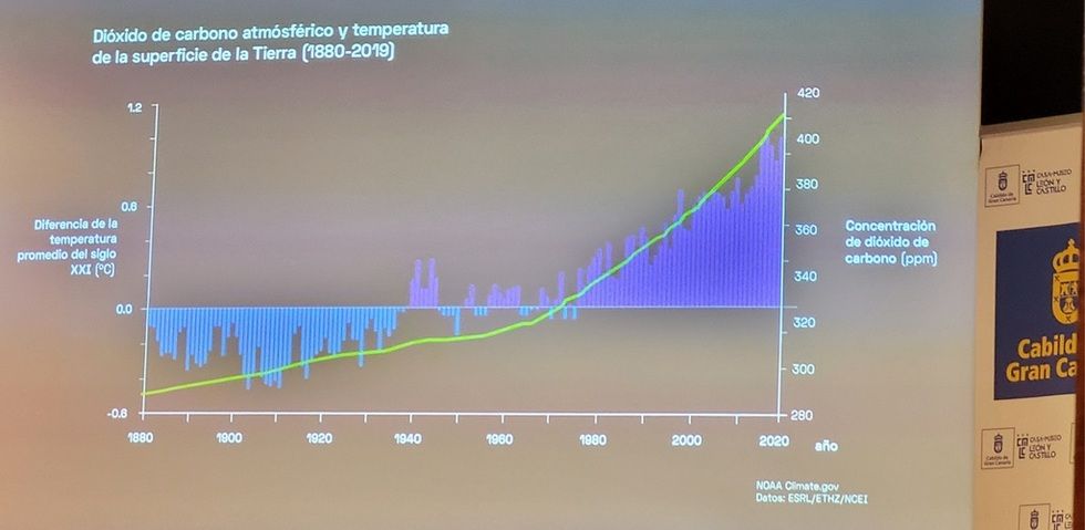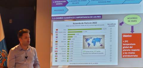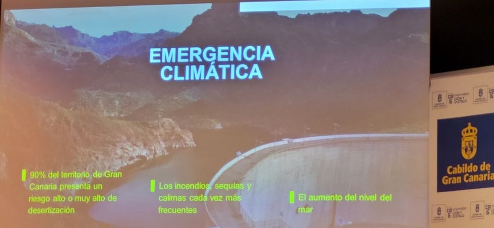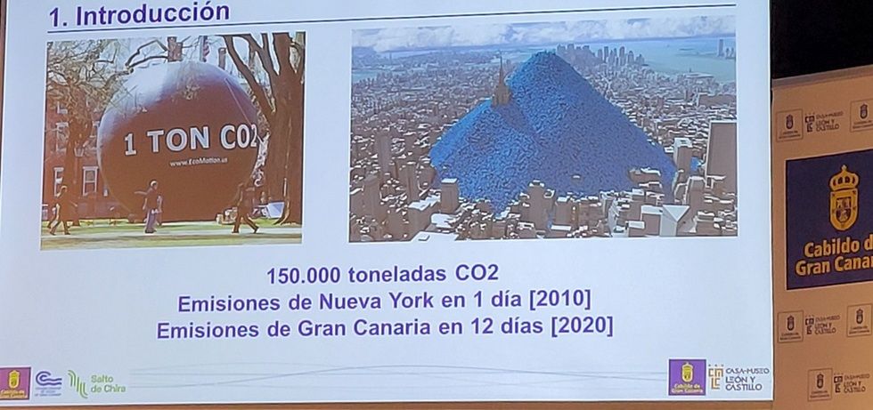 Finalizada esta ponencia interviene, Yonay Concepción Guodemar, ingeniero de caminos, canales y puertos, director técnico de la central hidroeléctrica de bombeo reversible Salto de Chira, que expone La central hidroeléctrica reversible Salto de Chira. Iniciando su exposición con unos gráficos alarmantes de la cantidad de CO2 que emitimos a la atmósfera y temperatura de la superficie de la Tierra, con los consiguientes efectos sobre el cambio climático y la emergencia climática por los indicadores registrados. El 90% del territorio de Gran Canaria presenta un riesgo alto o muy alto de desertización. Los incendios, sequías y calimas son cada vez más frecuentes. El aumento del nivel del mar.