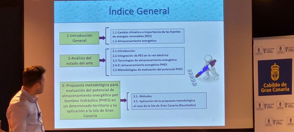 En su introducción general, análisis del arte y propuestas metodológicas, expone los principales referentes a tratar como el cambio climático e importancia de las fuentes de energías renovables RES (Renewable Energy Sources) y Almacenamiento energético. Integración de RES en la red eléctrica. Tecnologías de almacenamiento energético. El almacenamiento energético PHES (Pumped Hydro Energy Storage). Metodologías de evaluación del potencial PHES. Propuesta metodológica para evaluación del potencial de almacenamiento energético por bombero hidráulico (PHES) en un determinado territorio y su aplicación a la isla de Gran Canaria.