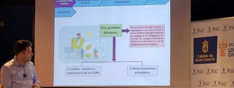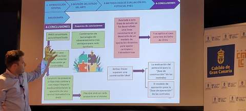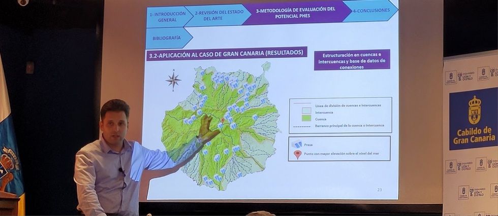 Culminan las Jornadas con un acercamiento a los proyectos de almacenamiento hidroeléctrico de energías renovables (RES Renewable Energy Sources) y desarrollo del almacenamiento energético con las conferencias impartidas, en primer lugar, don Hilario José Torres Herrera, doctor ingeniero industrial. Especialista en energías renovables, que imparte la conferencia, Potencial de las presas grancanarias para construir centrales hidroeléctricas.
