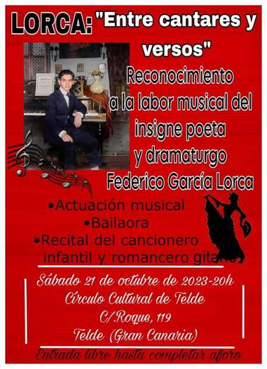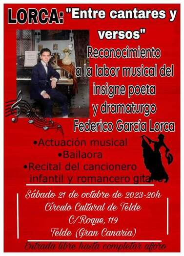 El acto presentado en la sede del Círculo Cultural de Telde, del Molino del Conde, cumplió con creces su cometido gracias a la exhaustiva labor de la escritora, compositora, folclorista y activista cultural teldense, Pino Monzón Padrón, creando un programa de actuaciones que con el título de “Lorca Entre cantares y versos” se realizó un reconocimiento a la labor musical del insigne poeta y dramaturgo con actuaciones musicales, bailaora, recitales del cancionero infantil y romancero gitano.