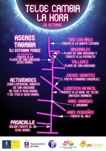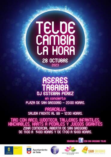 El Ayuntamiento de Telde ha lanzado un vídeo promocional del evento ‘Telde cambia la hora’ que tendrá lugar este sábado en Zona Comercial Abierta de San Gregorio coincidiendo con la llegada del horario de invierno. La programación incluye, además de actividades y talleres infantiles, las actuaciones musicales de Aseres, Tabaiba y DJ Esteban Pérez.