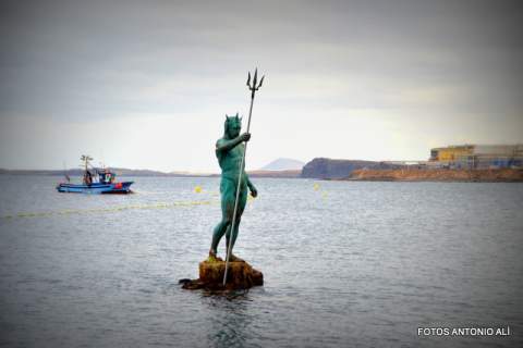 El personaje de portentosa musculatura y buen tratamiento anatómico, especialmente en lo concerniente a sus extremidades. También sobresale el tratamiento del sistema circulatorio más significativo y visible del cuerpo humano. La imagen de 4.20 metros de altura y un tridente de 5.50 metros, se encuentra anclada al pedestal de roca natural. Por otro lado, un foco de luz situado estratégicamente desde el muelle sirve para darle más aureola de poderío y dominio que enfatiza merced a su posición de cara a la playa.