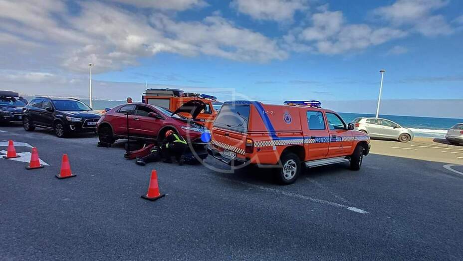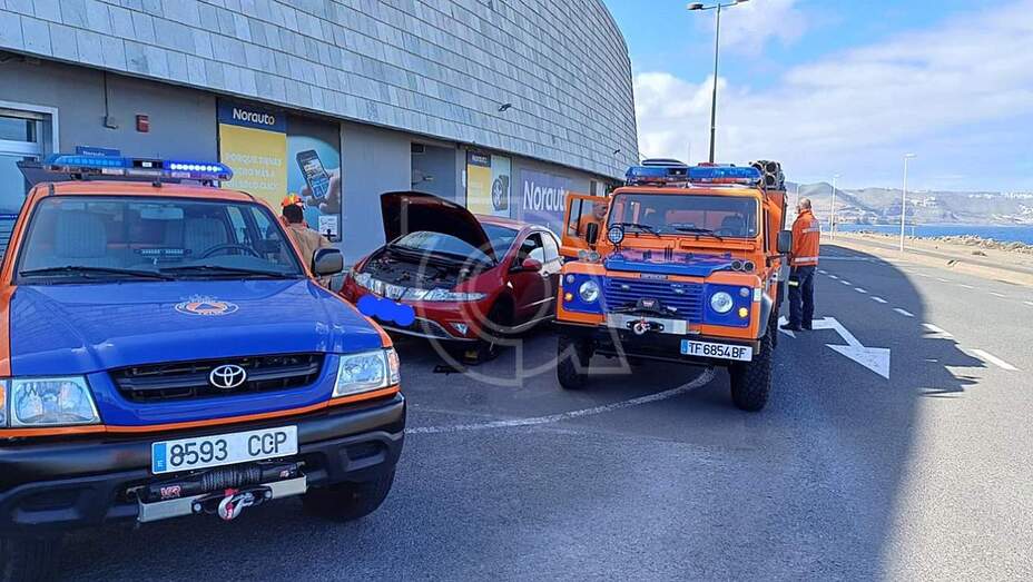 Un gato que había quedado atrapado en el motor de un vehículo que estaba en el parquin exterior del Parque Comercial Las Terrazas fue rescatado por voluntarios de Protección Civil de Telde.