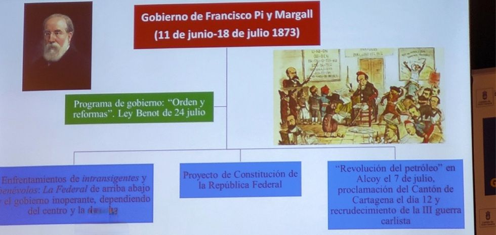 En un escenario político general en España tratando de buscar el camino hacia una República definitiva hay varios intentos entre las diferentes ideologías y puntos de vista de los protagonistas capaces de llegar a acuerdos. El primer presidente Estanislao Figueras, gobierno del 11 de febrero al 10 de junio de 1873, que harto de la situación por los conflictos dimite y le sucede como presidente Pi y Margall con su programa de gobierno “Orden y Reformas” Ley Benot de 24 de julio y proyecto de Constitución de la República Federal, encontrándose con fuertes conflictos como la proclamación del Cantón de Cartagena y el recrudecimiento de la III Guerra Carlista, le llevan a dimitir el 18 de julio de 1873.