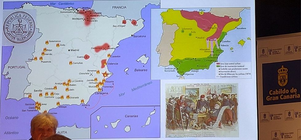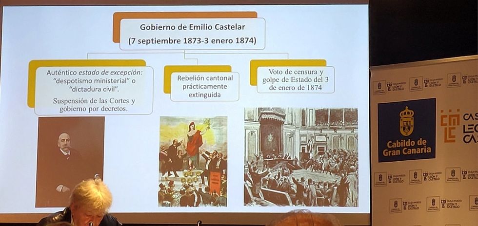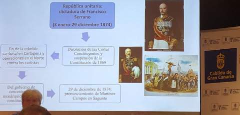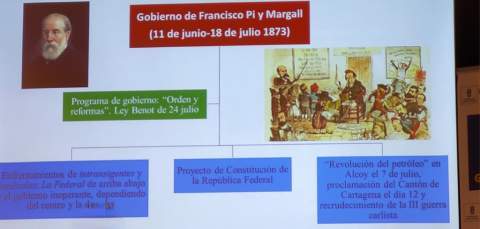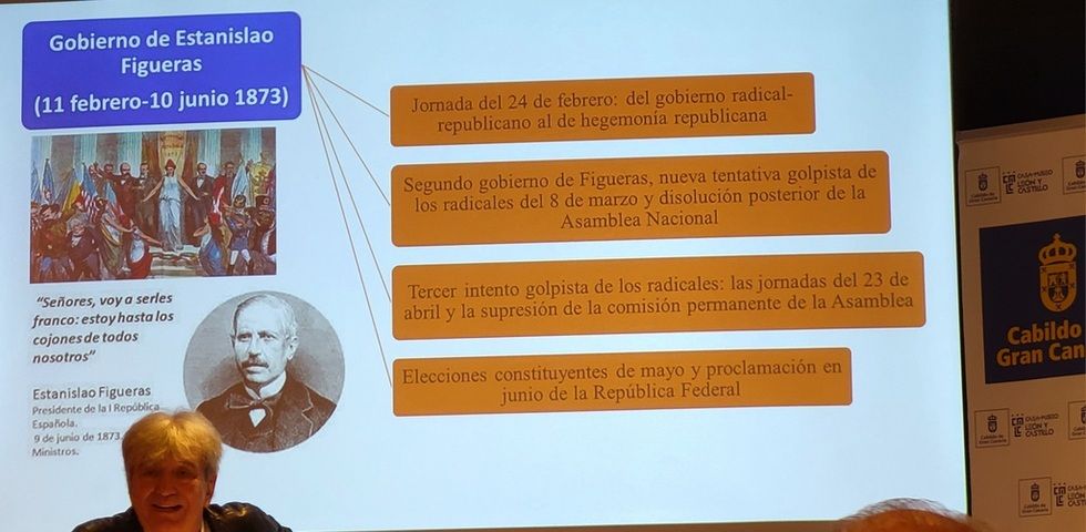 Para comprender el desarrollo de los acontecimientos de esta compleja etapa del siglo XIX español, en esta última sesión los asistentes tuvimos la oportunidad de escuchar a un especialista en la República y su contexto histórico, social, político, económico y cultural, el doctor Agustín Millares Cantero, historiador canario, profesor jubilado de la ULPGC. Cofundador y miembro del Seminario de Estudios Históricos Canarios y del Seminario Millares Carlo del Centro Asociado de la UNED de Las Palmas de Gran Canaria (1975-1988). Miembro fundador y primer presidente de la Fundación Canaria Juan Negrín, experto en la historia del movimiento obrero canario y del republicanismo federal español. Cofundador y directivo del Grupo de Difusión Cultural Espiral. Hijo Predilecto de Las Palmas de Gran Canaria.