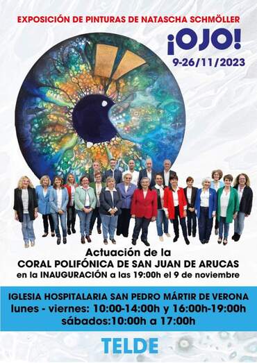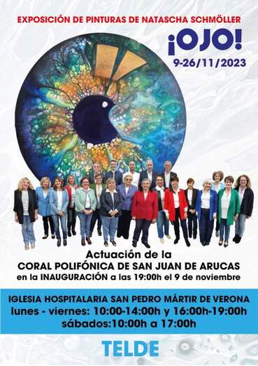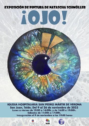 La Ermita de San Pedro Mártir acoge, a partir de este jueves 9 de noviembre y hasta el día 26 del mismo mes, la exposición Ojo de la artista Natascha Schmöller. La inauguración tendrá lugar en la misma Iglesia Hospitalaria, esta tarde, a las 19.00 horas, con la actuación de la Coral de San Juan de Arucas, y estará abierta al público de lunes a viernes de 10.00 a 14.00 y de 16.00 a 19.00 horas y los sábados de 11.00 a 17.00 horas.