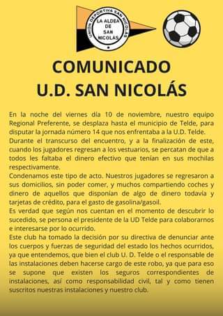 La UD San Nicolás, de la Aldea de San Nicolás, ha denunciado en redes sociales, y lo hará ante la Policía, el robo de sus pertenencias el pasado viernes, durante el partido de la jornada 14 de Regional Preferente que disputaron contra la UD Telde en las instalaciones teldenses. El responsable o los responsables del hurto -se desconoce cuántas personas fueron-, se llevaron más de 400 euros en efectivo del vestuario donde el equipo dejó sus pertenencias antes del partido.