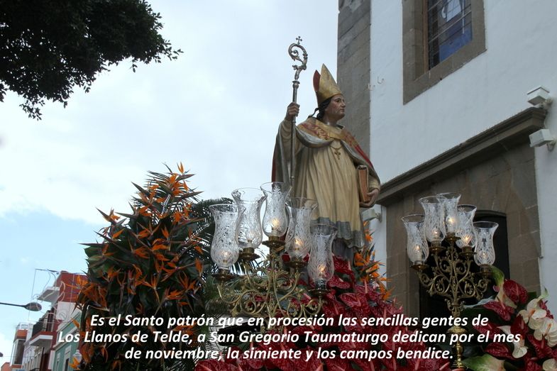 En este emblemático rincón del primigenio Telde de miles historias, de experiencias vividas, relatadas y transmitidas por nuestros antepasados, bajo los cielos que cubren toda la geografía urbana y rural de este rincón de ciudad labrada, escrita, trabajada y desarrollada por el propio pueblo que habitó desde sus inicios entorno a los asentamientos de ingenios azucareros, campos de cultivo, ermitas y rogativas, bendecir el surco, para mejores cosechas y aguas por caer, cumplir al paso procesional con el santo patrón San Gregorio, y la bendición de las tierras en su día grande el viernes 17. Las fiestas comienzan, viva y nos bendiga San Gregorio patrón de Los Llanos de Telde. Gracias.