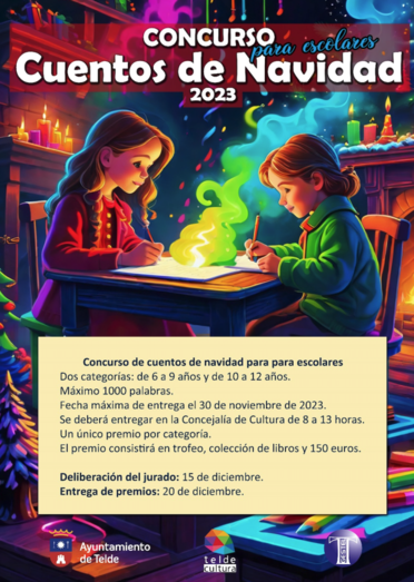 La Concejalía de Cultura del Ayuntamiento de Telde, liderada por Juan Martel, y la Empresa Municipal de Gestión Gestel SL, presentan el concurso Cuentos de Navidad 2023, para escolares de la ciudad de entre 9 y 12 años. Los participantes podrán explorar el tema navideño en relatos inéditos de hasta 1.000 palabras, evaluados por su originalidad, redacción y contenido.