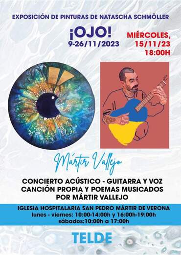 En el marco de la exposición de pinturas ¡Ojo! de la artista Natascha Schmöller, tendrá lugar un concierto acústico de guitarra y voz con canción propia y poemas musicados por Mártir Vallejo, compositor bilbaíno afincado en Gran Canaria.