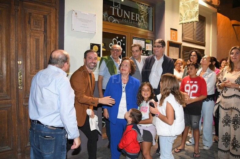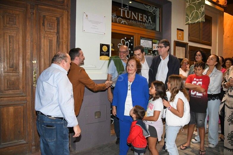 Durante el trayecto se descubrieron cuatro placas en honor a hombres y mujeres que han contribuido a la grandeza de Telde. La primera, en el inmueble de la calle de Juan Diego de la Fuente que fue hogar familiar y tienda de comestibles regentada en su día por María del Pino de la Nuez y Juan Martín Saavedra. La siguiente en el edificio que albergó en la vía Betancor Fabelo la célebre panadería de los hermanos Pérez, cuyos dueños fueron Antonio y José Pérez Pérez.