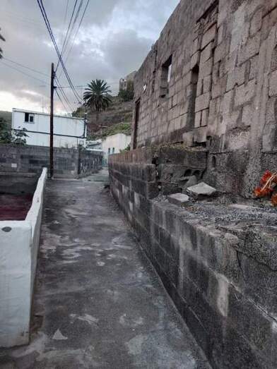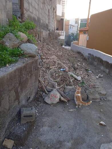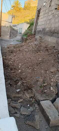 El muro de una construcción en estado de deterioro ubicada en el número 12 de la calle de Blas de Otero, denunciado en varias ocasiones por vecinos y colectivos de la zona del casco de Jinámar, ha terminado cediendo y se ha desplomado sobre el camino usado por residentes para acceder a sus viviendas.