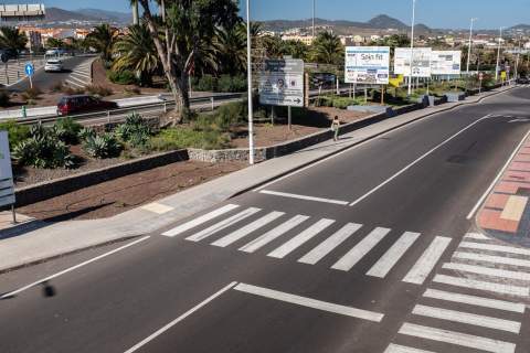 Nada más acceder al Parque Empresarial llama la atención encontrar un acceso mucho más desahogado, con carriles más amplios y recién asfaltados, y con una nueva acera muy transitada que conecta peatonalmente en condiciones de accesibilidad y seguridad con la parada de guagua de la GC-1.