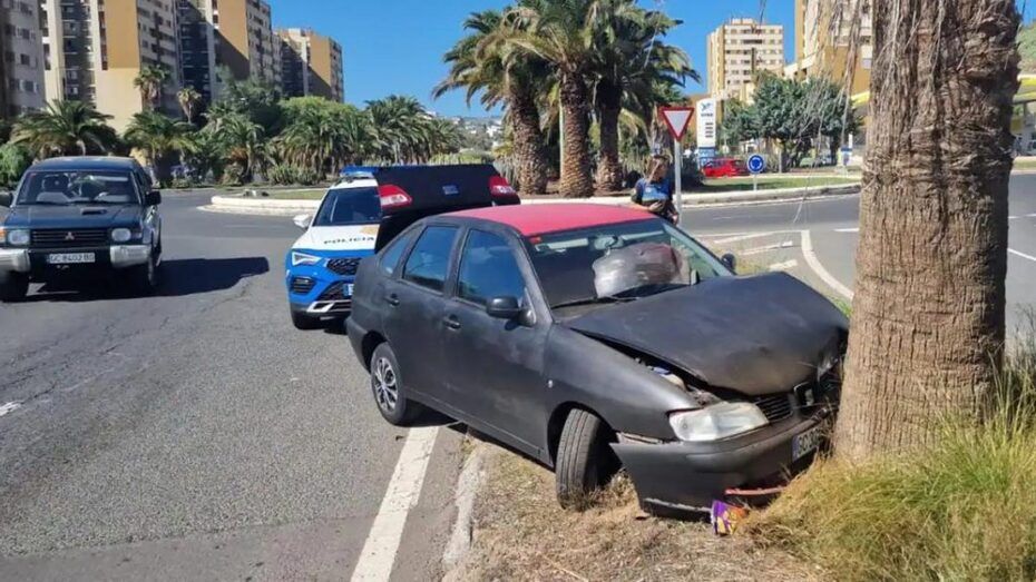 Un accidente en Las Ramblas de Jinámar este sábado al mediodía dejó una estampa más que singular, con el vehículo incrustado en una de las palmeras de la mediana, la carrocería afectada en la parte delantera, los neumáticos delanteros bloqueados y sin noticias del conductor, que dejó el turismo en dicho punto.