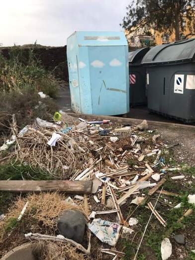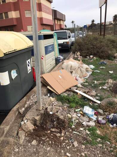 Vecinos de San Antonio denuncian un vertido de basuras, con restos de madera, recipientes, cartones y plásticos junto a los contenedores ubicados próximos al Edificio Plaza.
